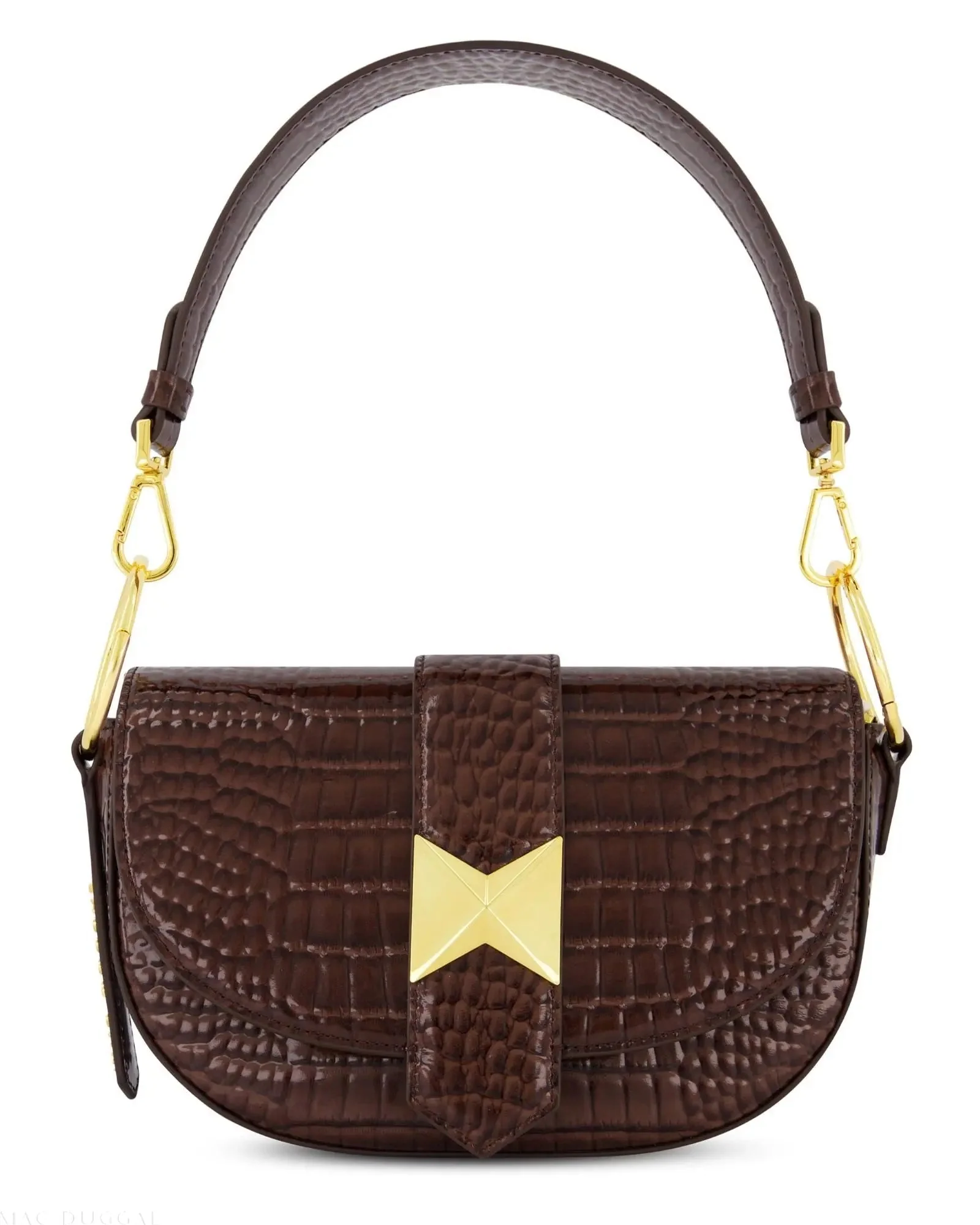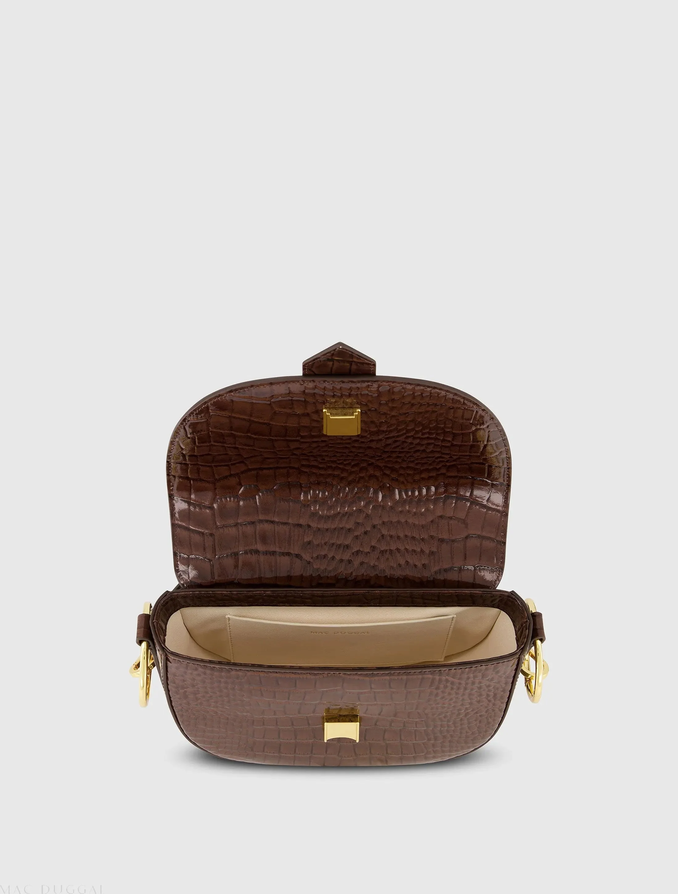 Brown Crocodile Leather Saddle Bag With Gold Hardware