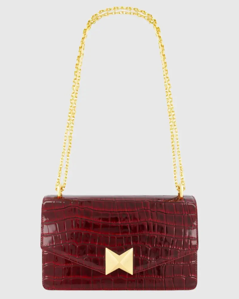 Red Crocodile Leather Shoulder Bag With Gold Hardware