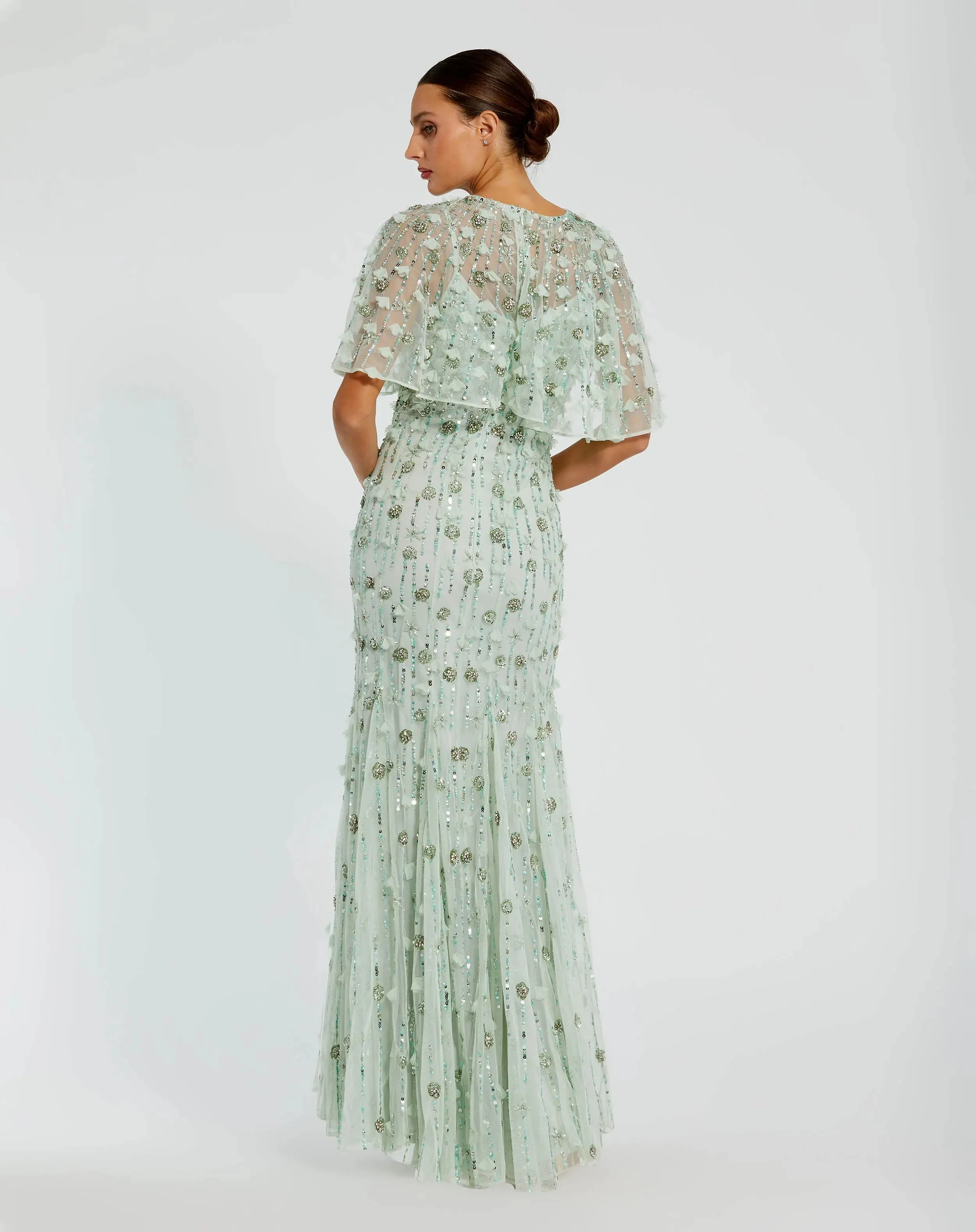 Green Embellished Illusion Cape Sleeve Trumpet Gown