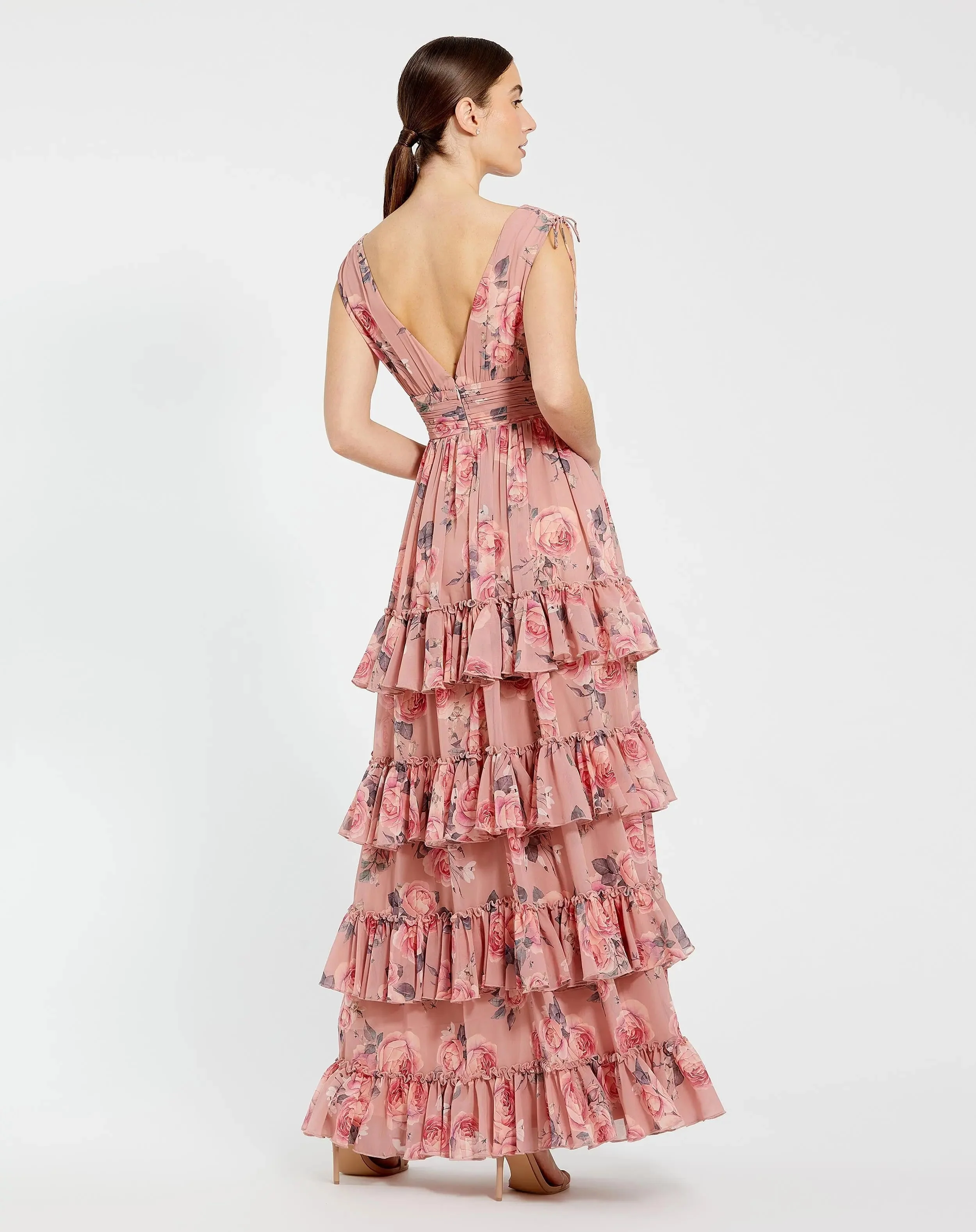 Pink Drawstring Shoulder Chiffon Tiered Floral Dress