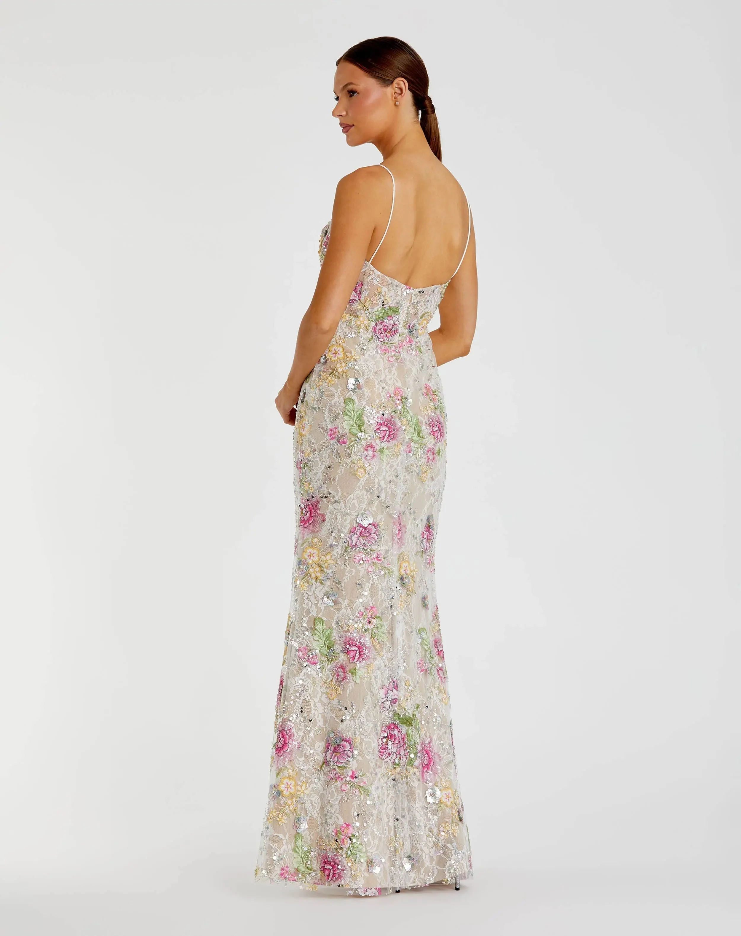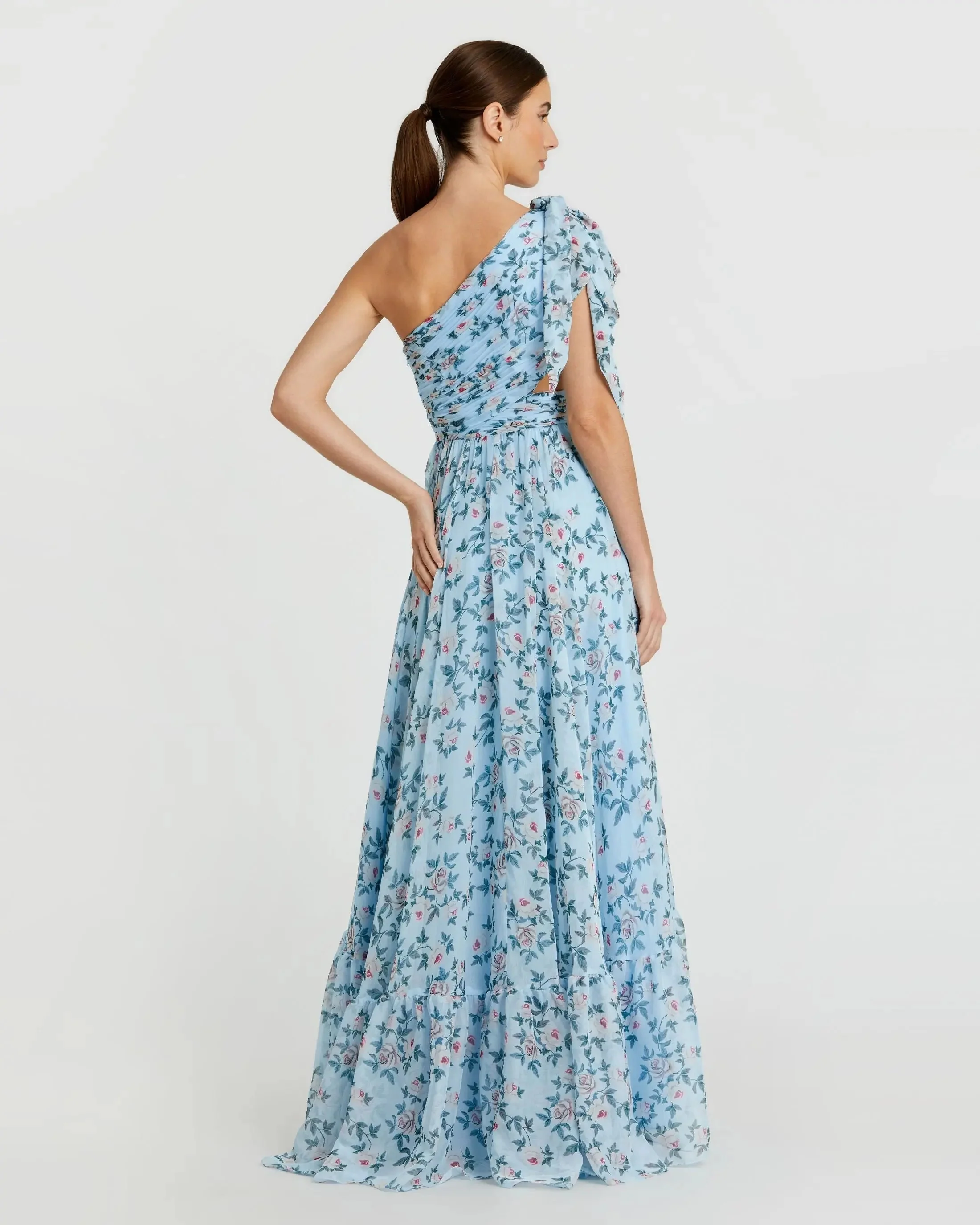 Blue Floral Brocade Sleeveless Midi Dress With Bow