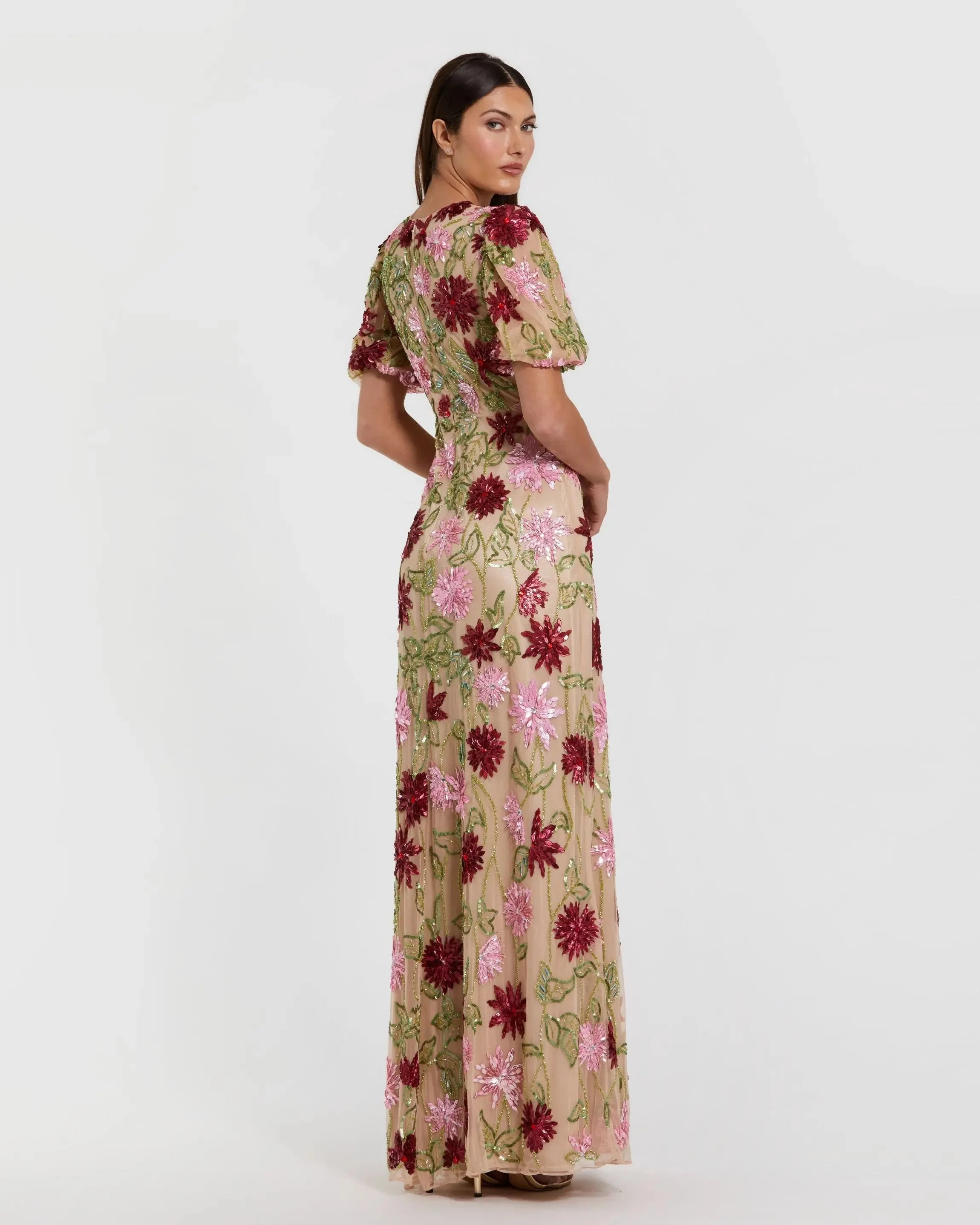 Beige Floral Beaded Mesh Puff Sleeve Gown