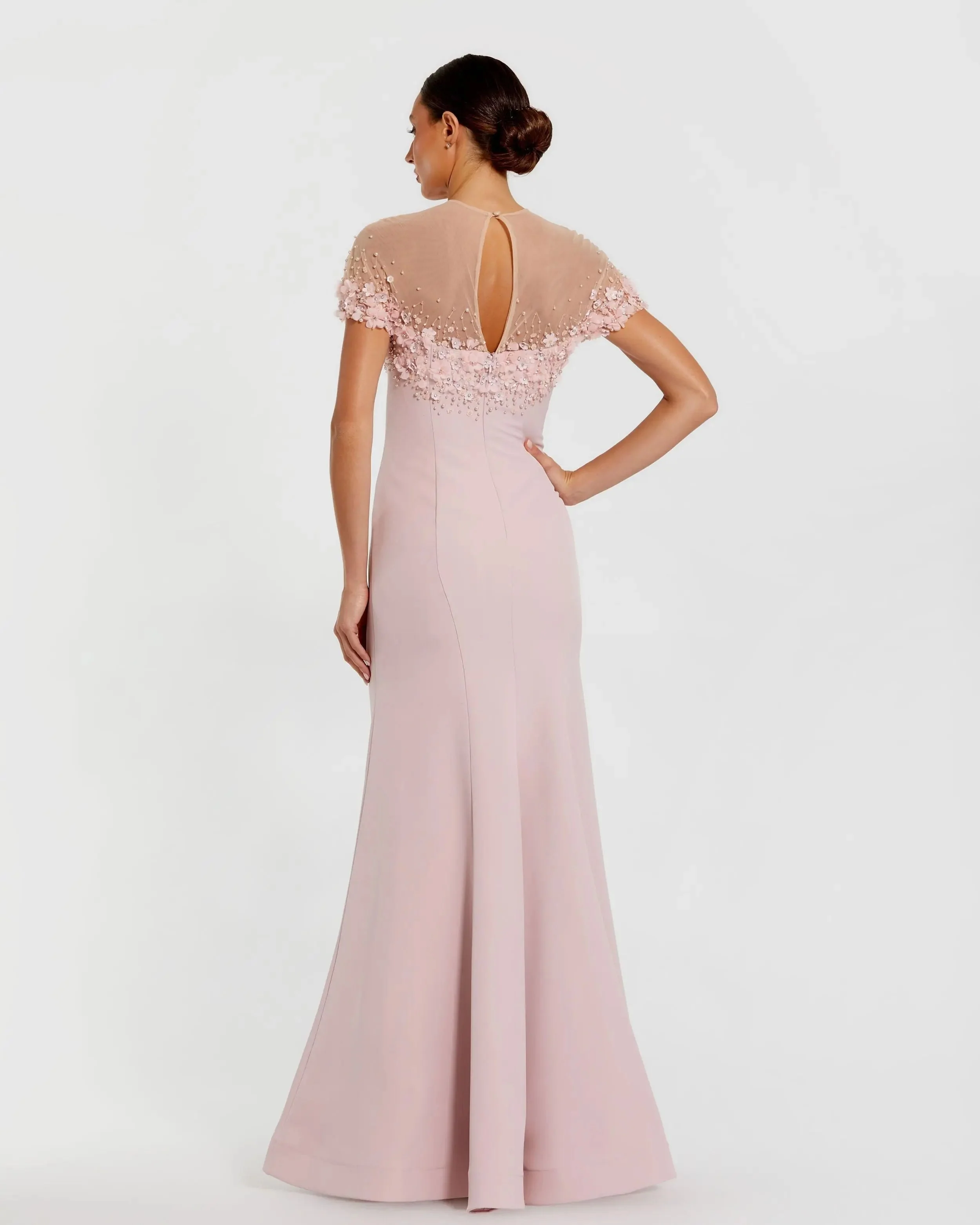 Pink Mermaid Crepe Gown With Beaded Illusion Neck