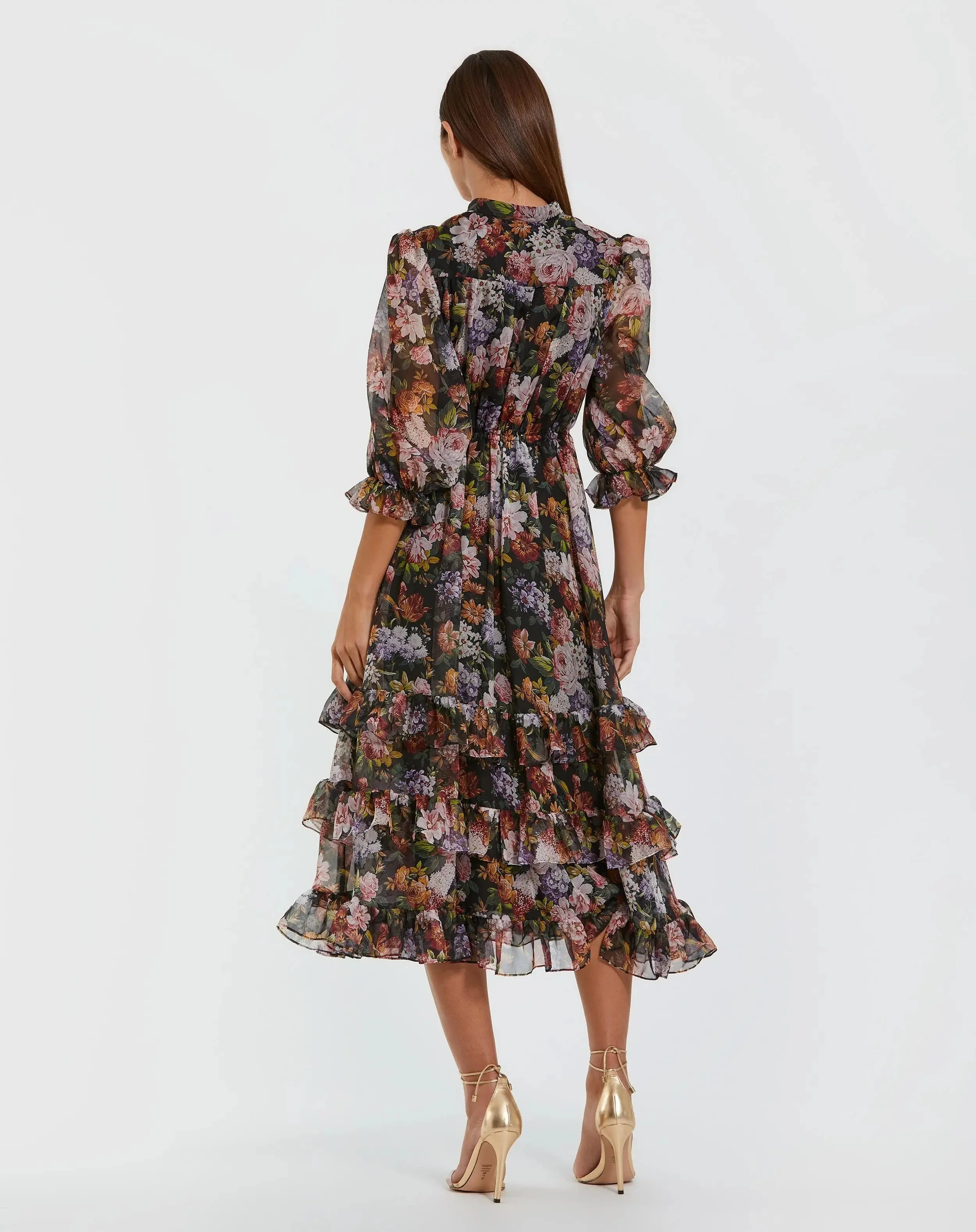 Black Floral Chiffon Ruffle Midi Dress with 3/4 Sleeves