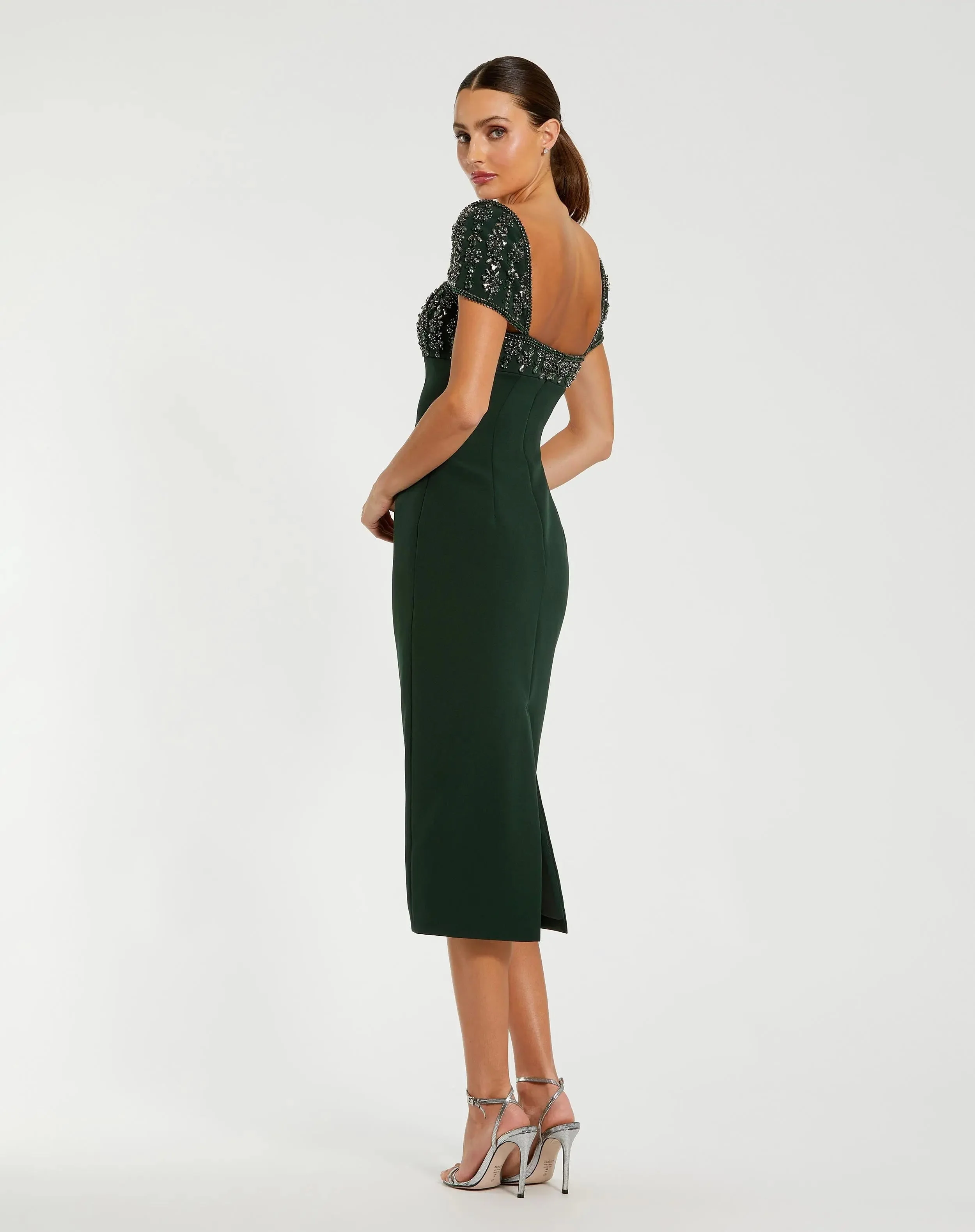 Green Embellished Cap Sleeve Crepe Midi Dress