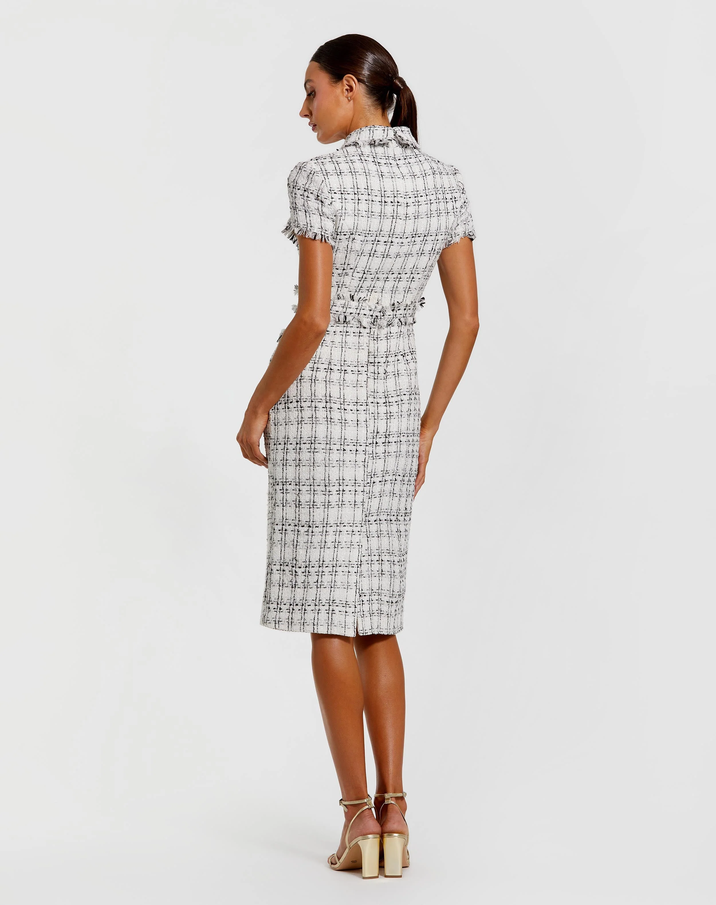 White Fitted Boucle Short Sleeve Button Up Midi Dress