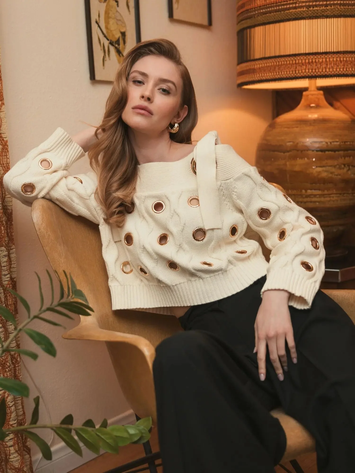 Ivory Chunky Knit Off The Shoulder Grommet Cropped Sweater - FINAL SALE