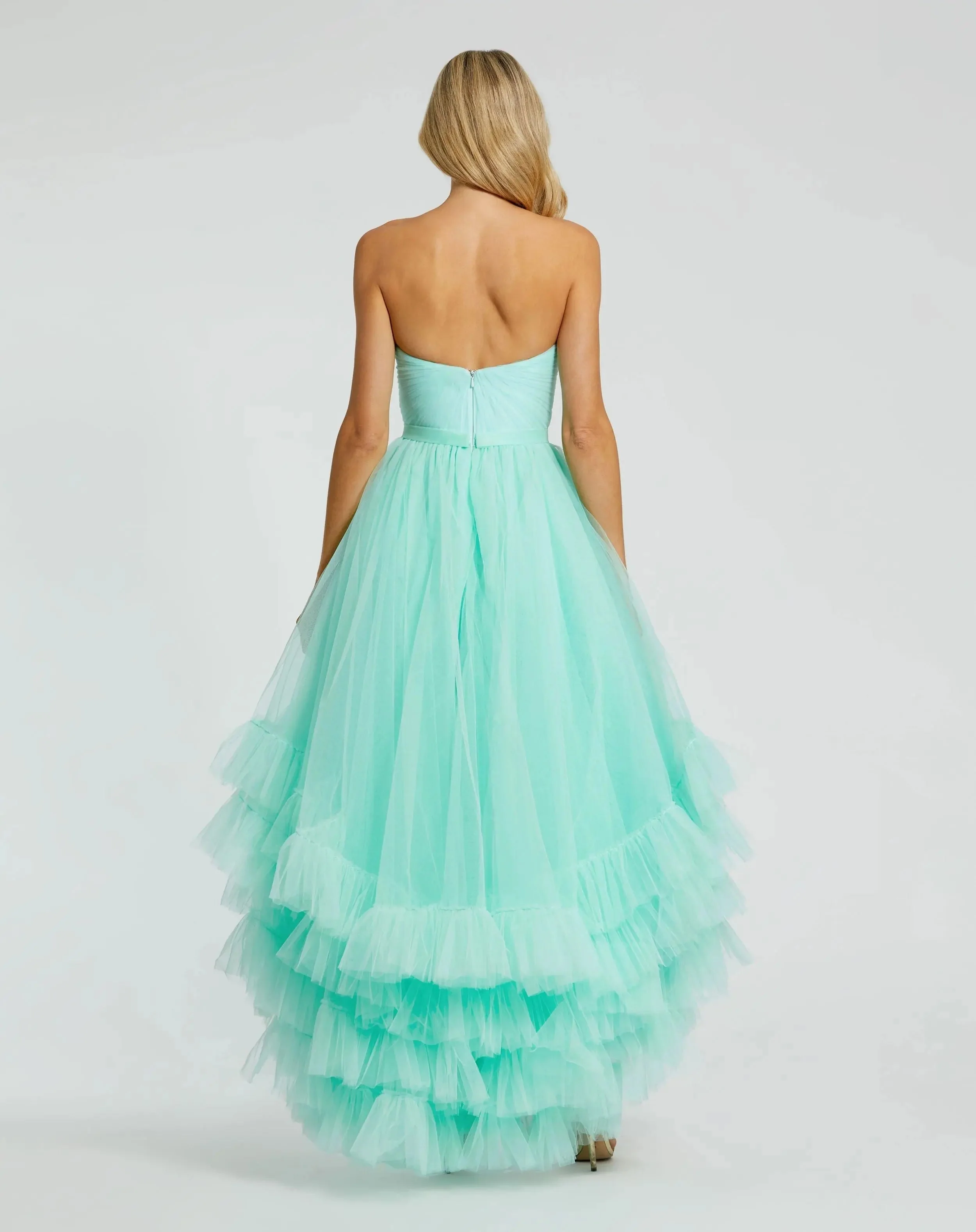 Green Strapless Ruched Sweetheart Ruffle High Low Gown
