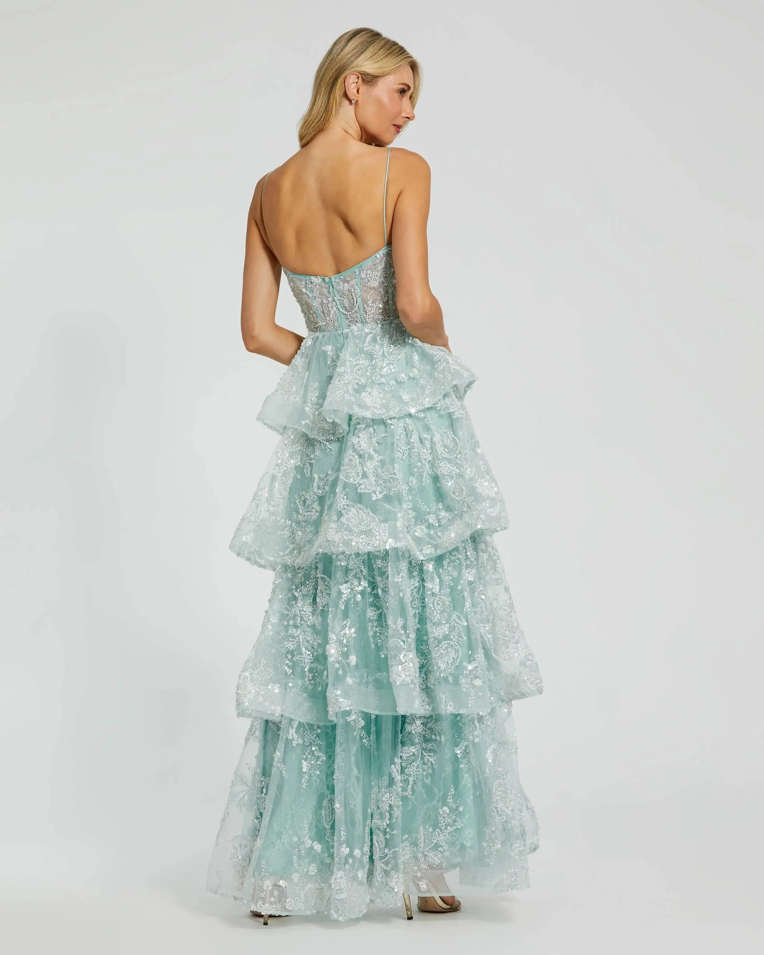 Green Spaghetti Strap Applique Tiered Ruffle Gown