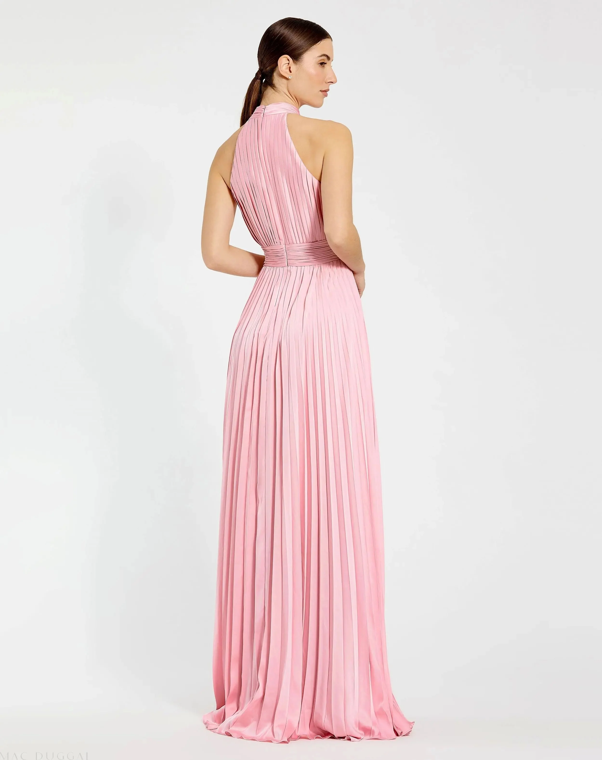 Pink Pleated High Neck Satin Sleeveless Halter Gown