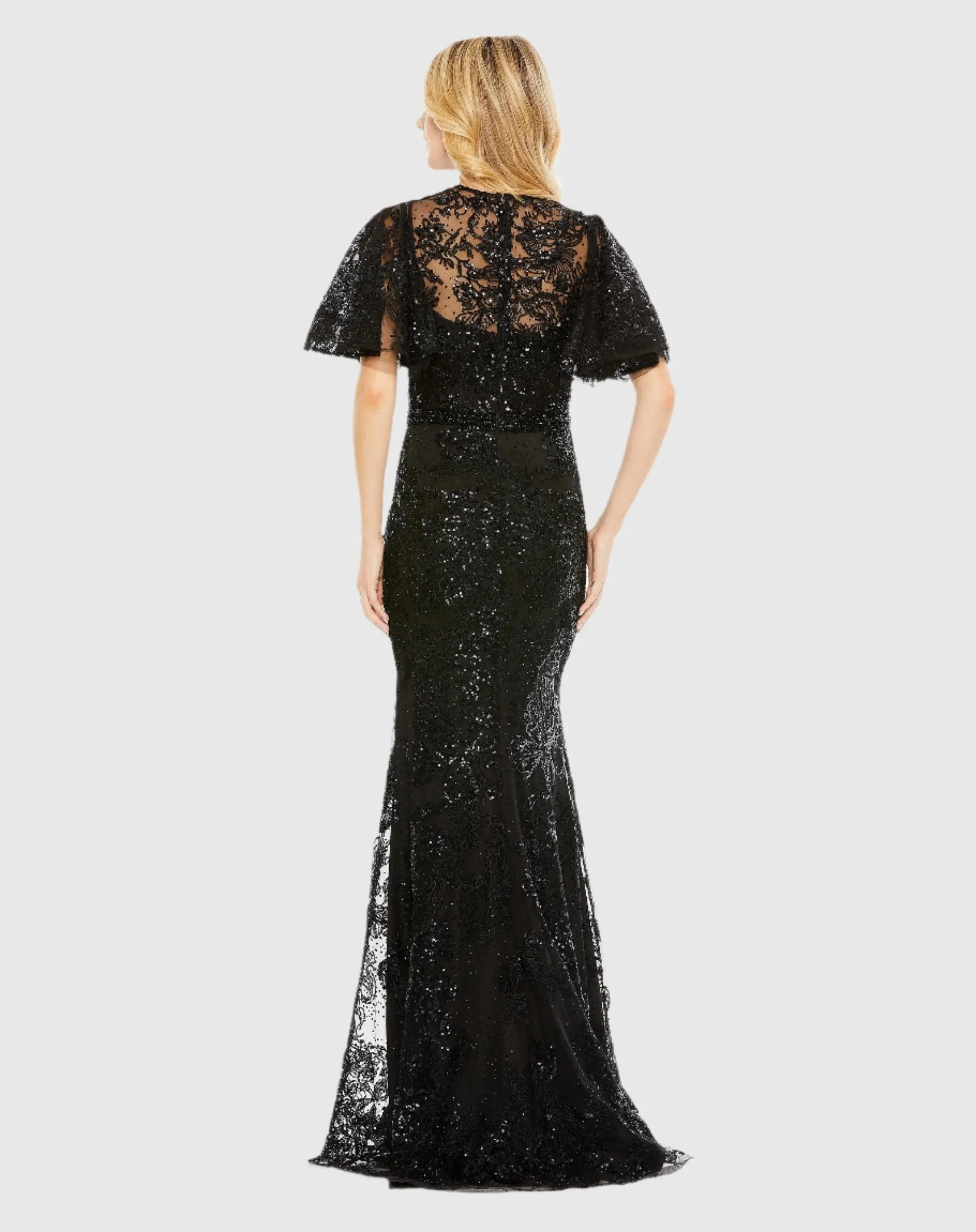 Black Embellished Flutter Sleeve High Neck Gown