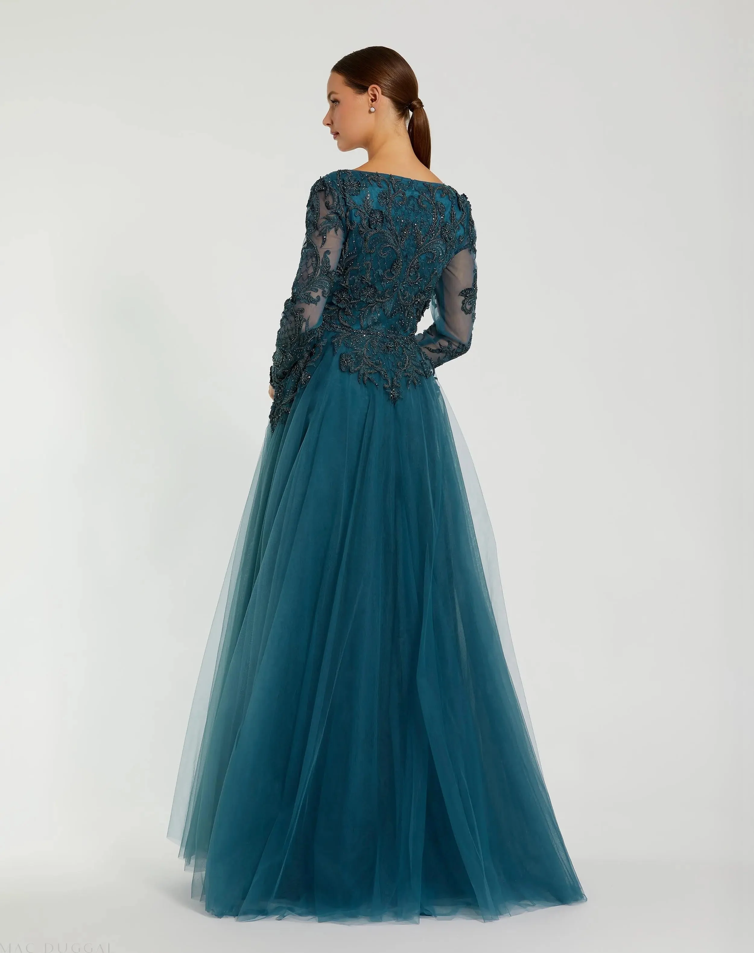 Teal Long Sleeve Embellished Tulle Gown
