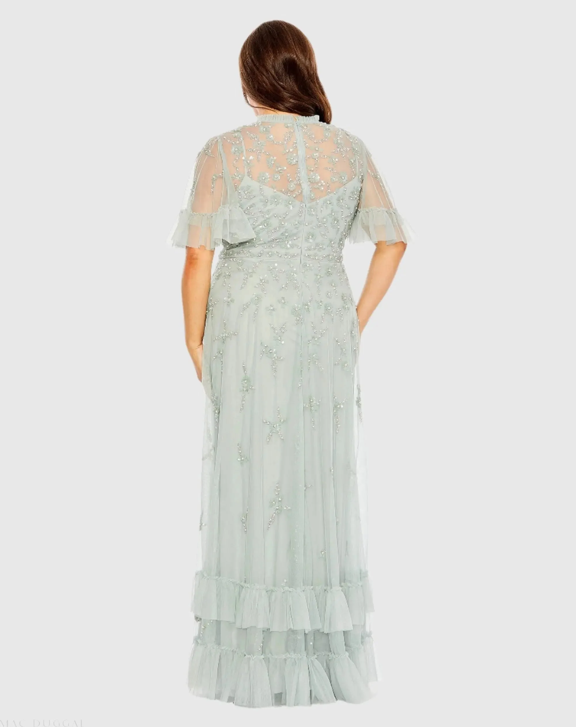 Green Embellished Flutter Sleeve Ruffle Tiered Gown