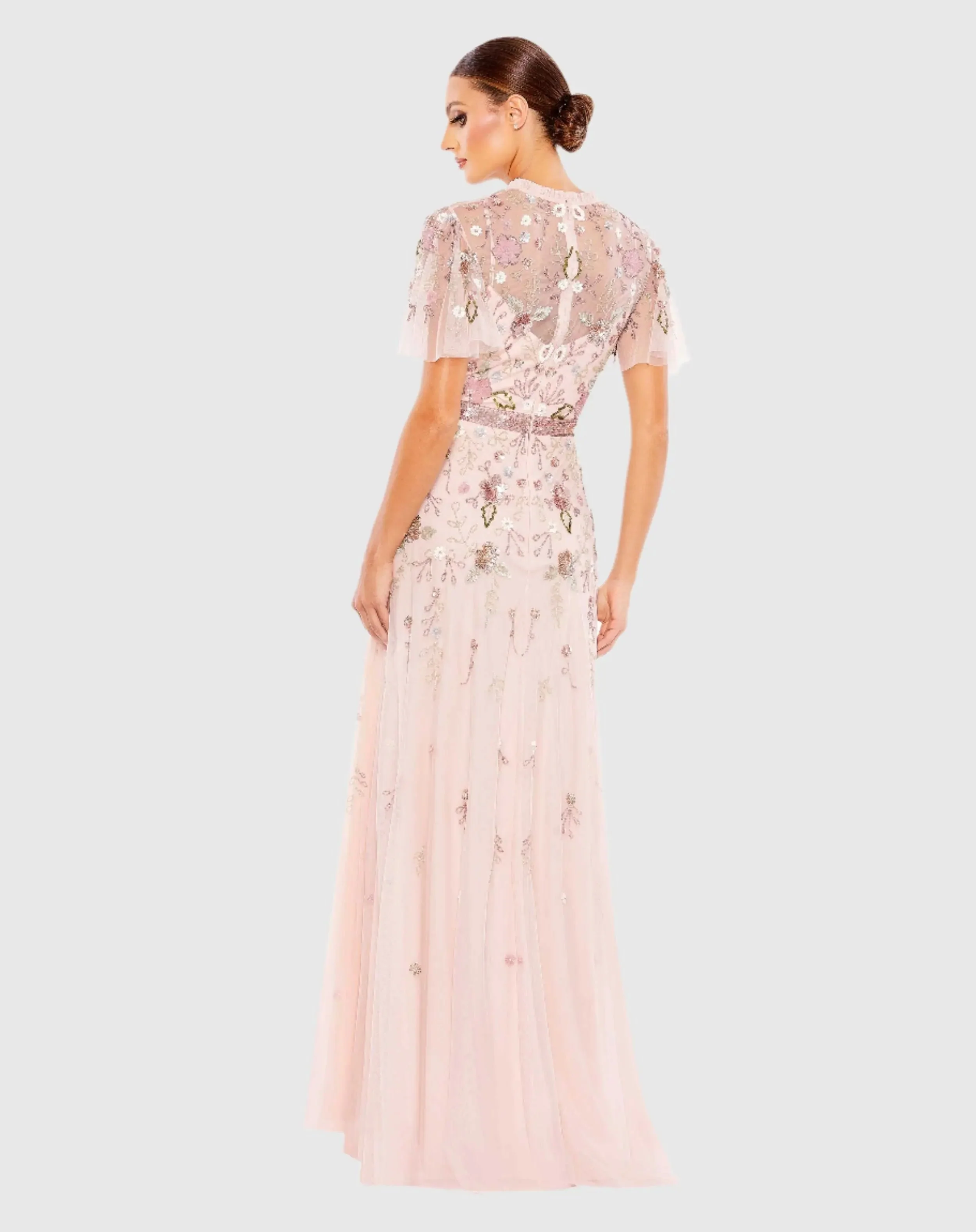 Pink Embellished High Neck Butterfly Sleeve Gown