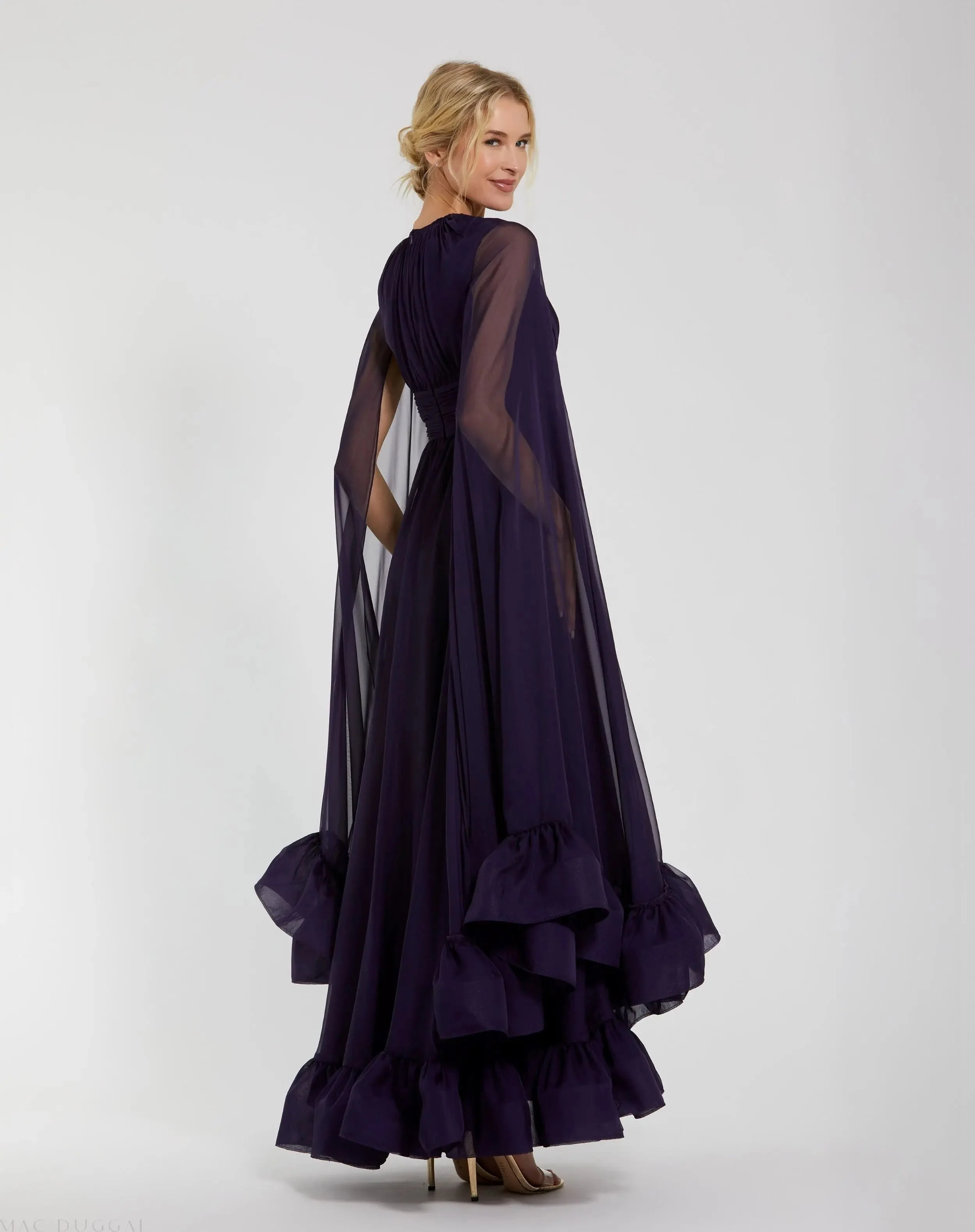 Purple Chiffon Cape Sleeve Ankle-Length Dress With Keyhole
