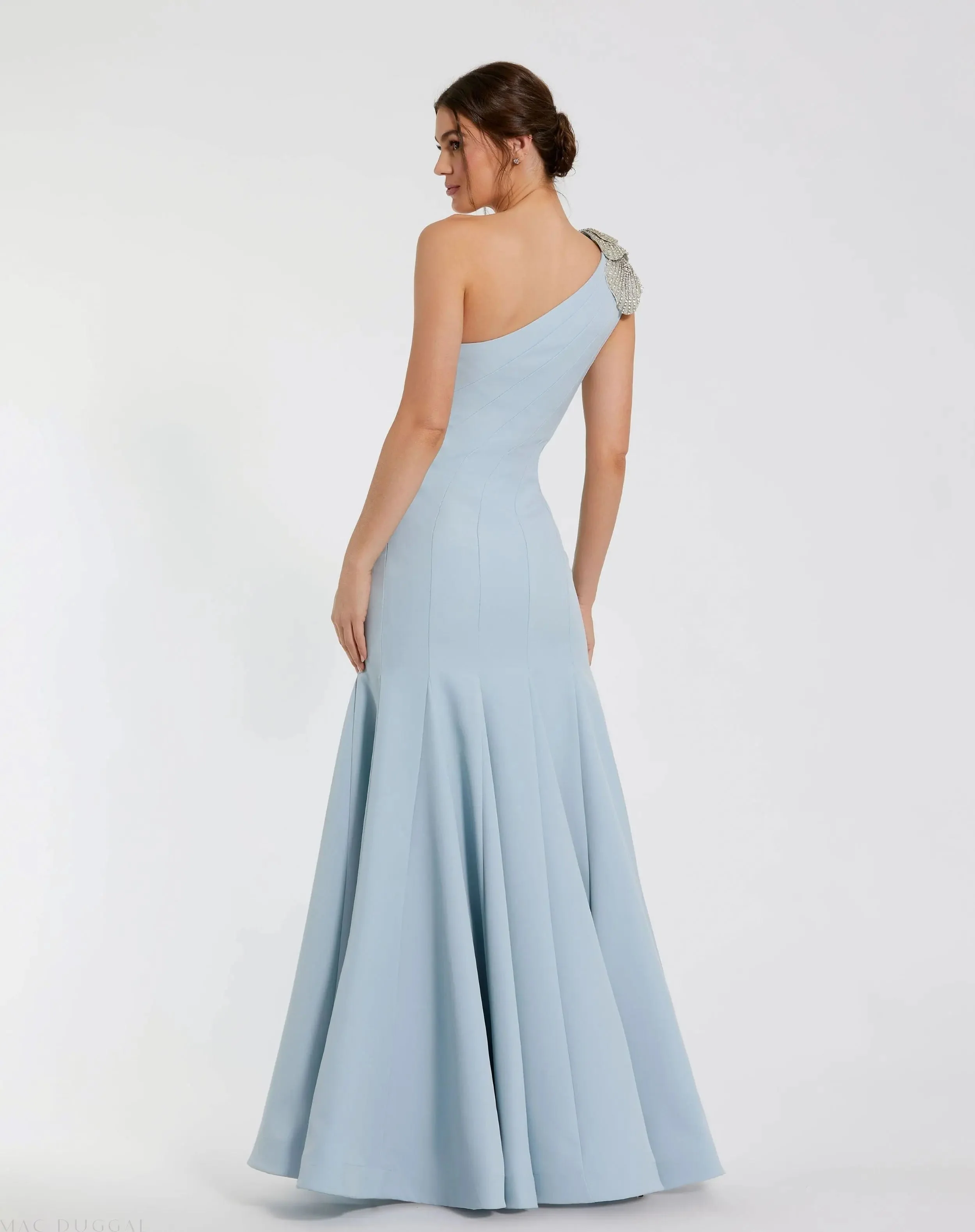 Blue Crepe One Shoulder Gown With Crystal Flower