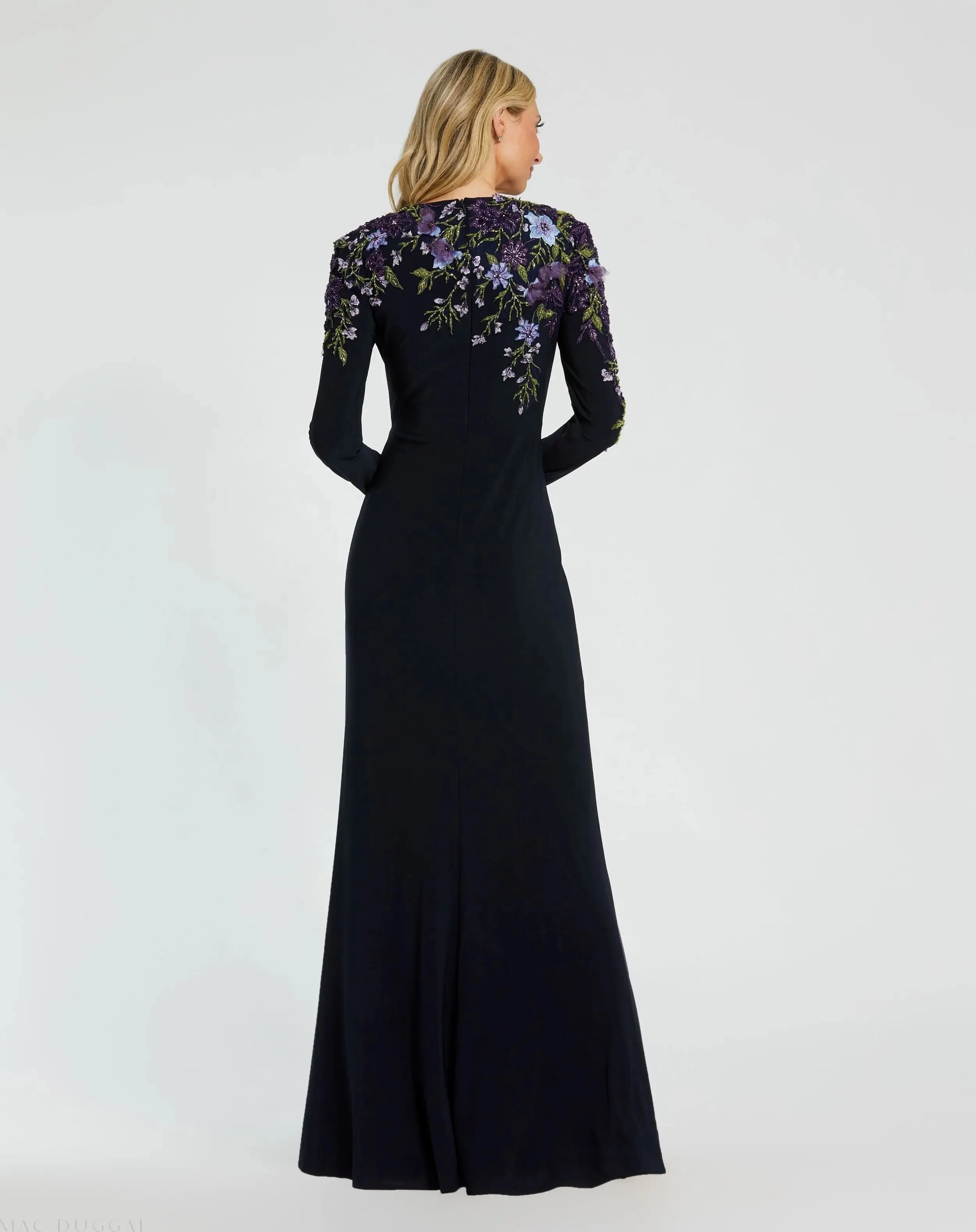 Navy Embellished Long Sleeve Fitted Jersey Gown