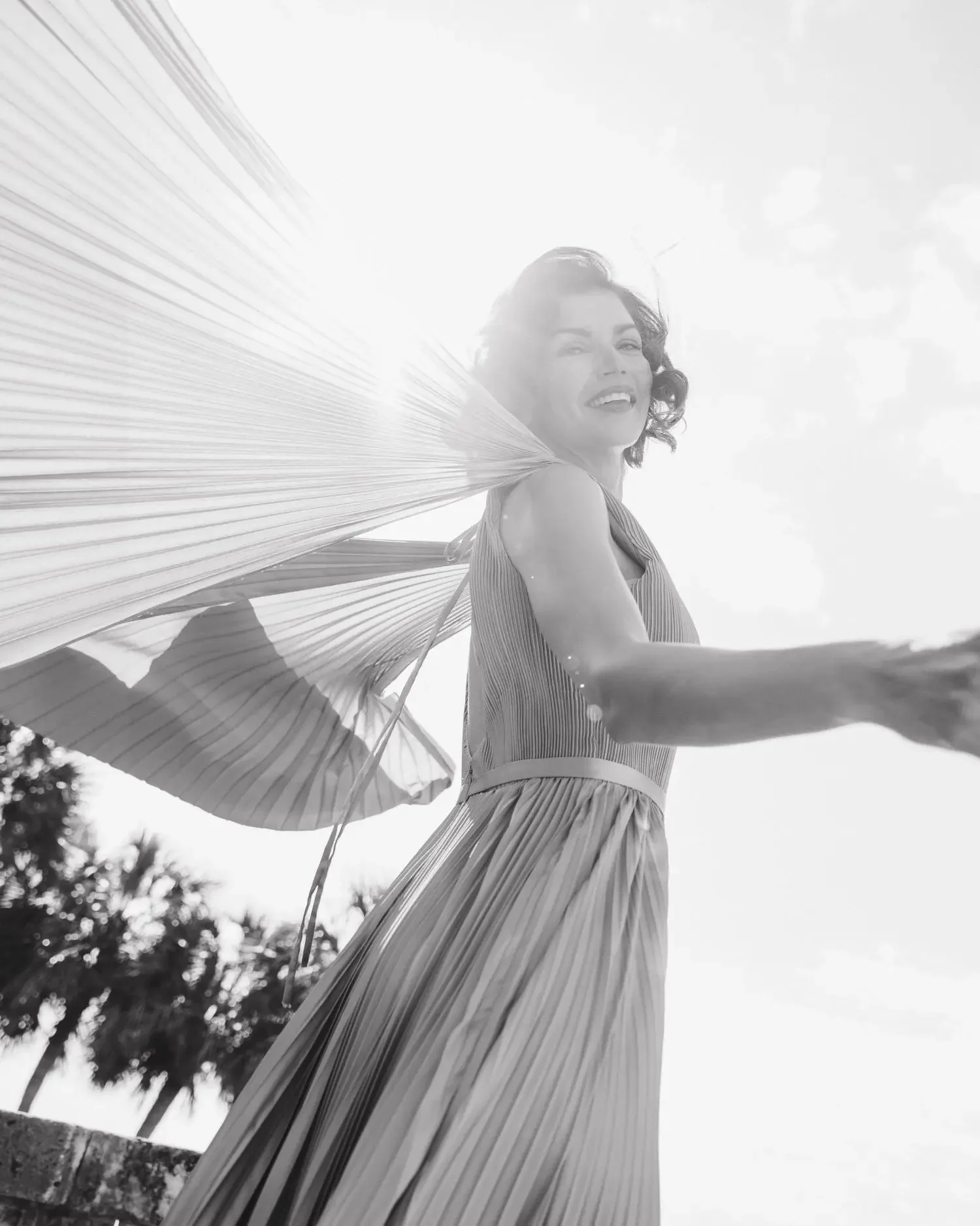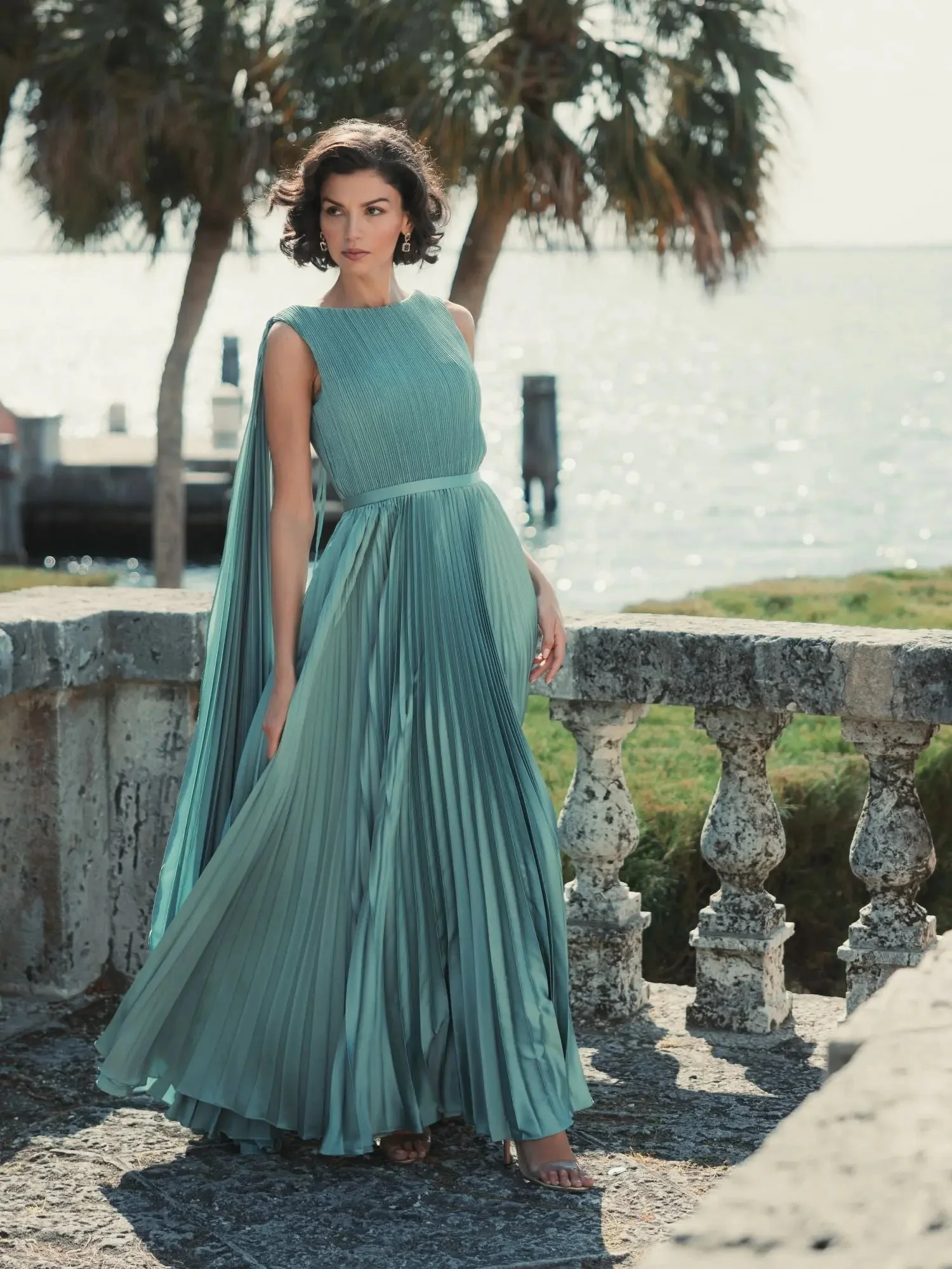 Green Sleeveless High Neck Cape Back Heat Pleated Gown