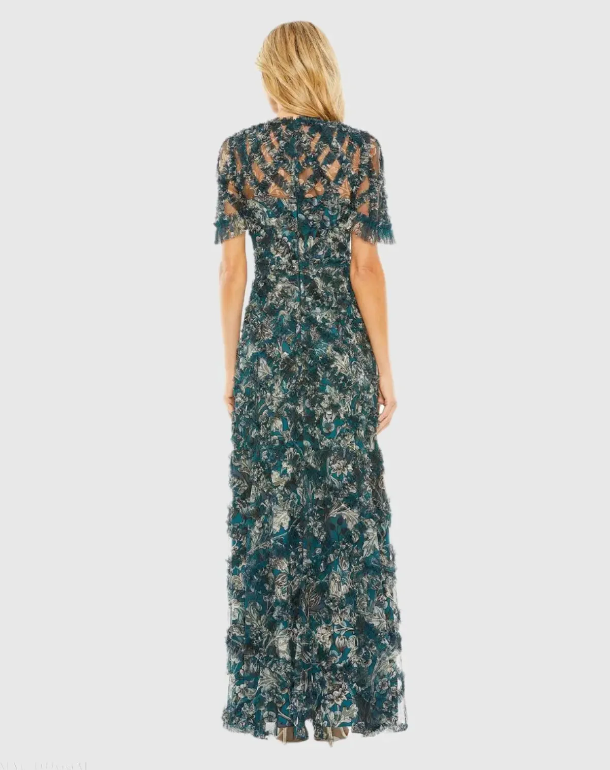 Blue Flutter Sleeve Floral Ruffle Detail Maxi Dress