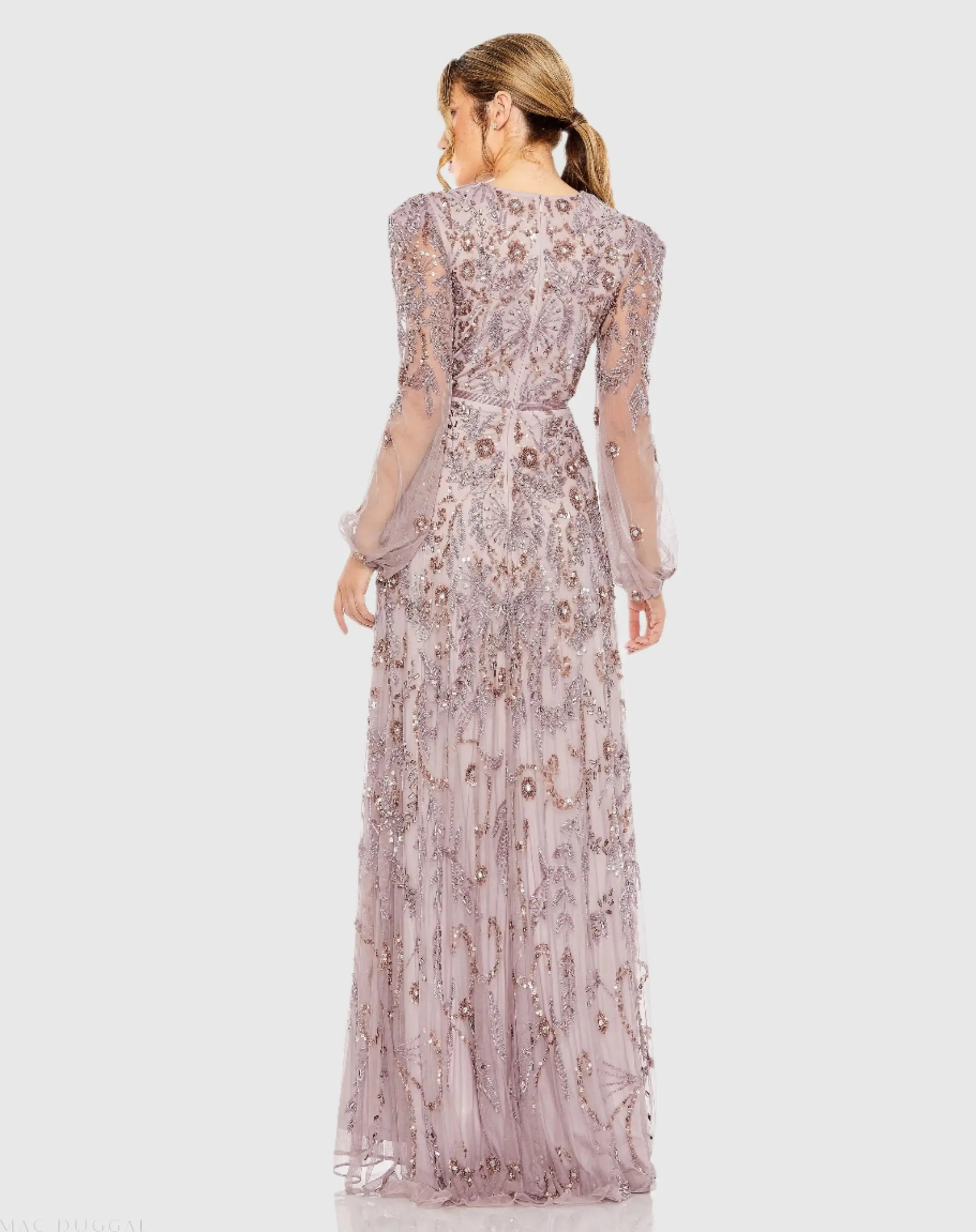 Silver Sequined Wrap Over Bishop Sleeve Gown