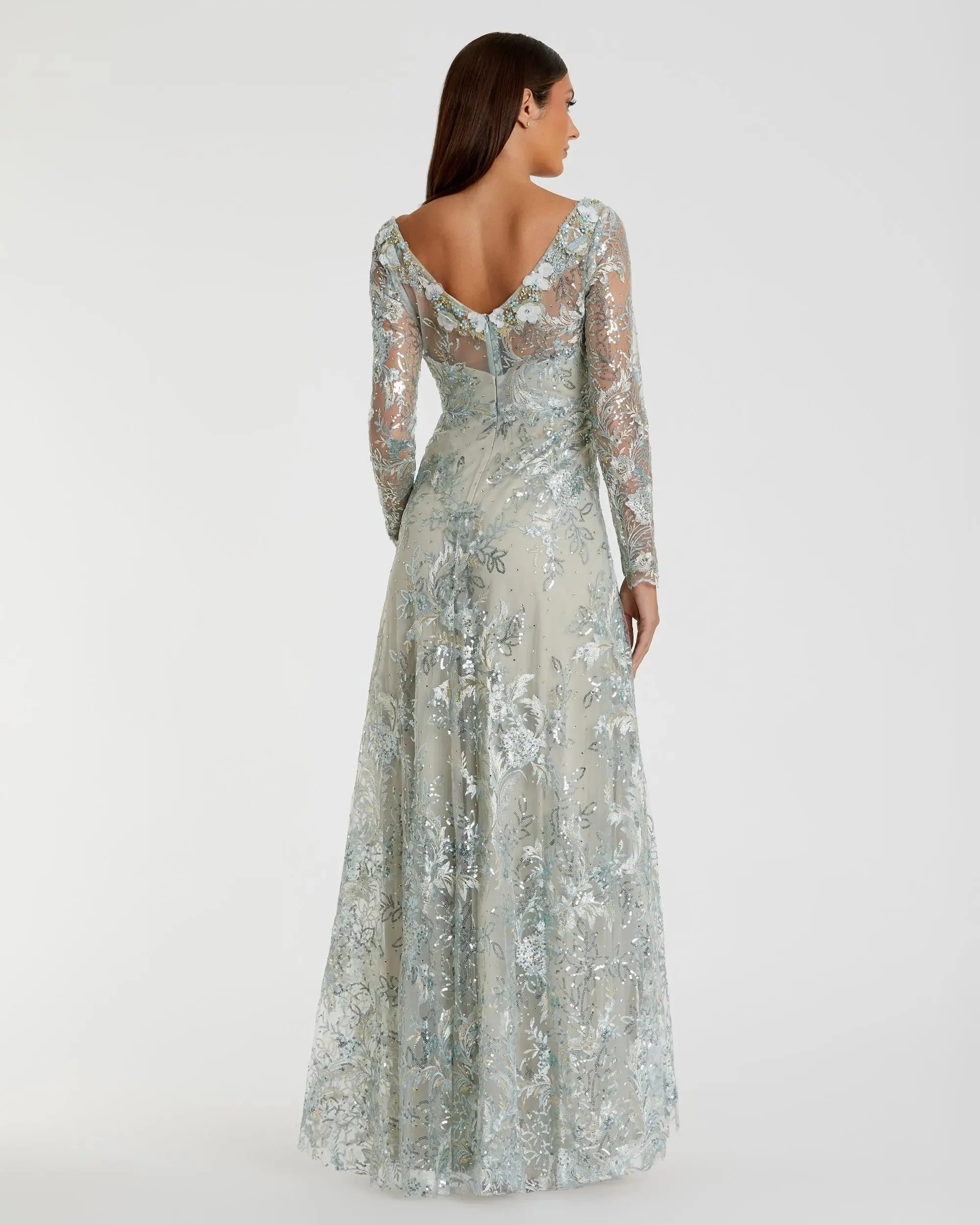 Green Floral Embroidered Illusion Long Sleeve Gown