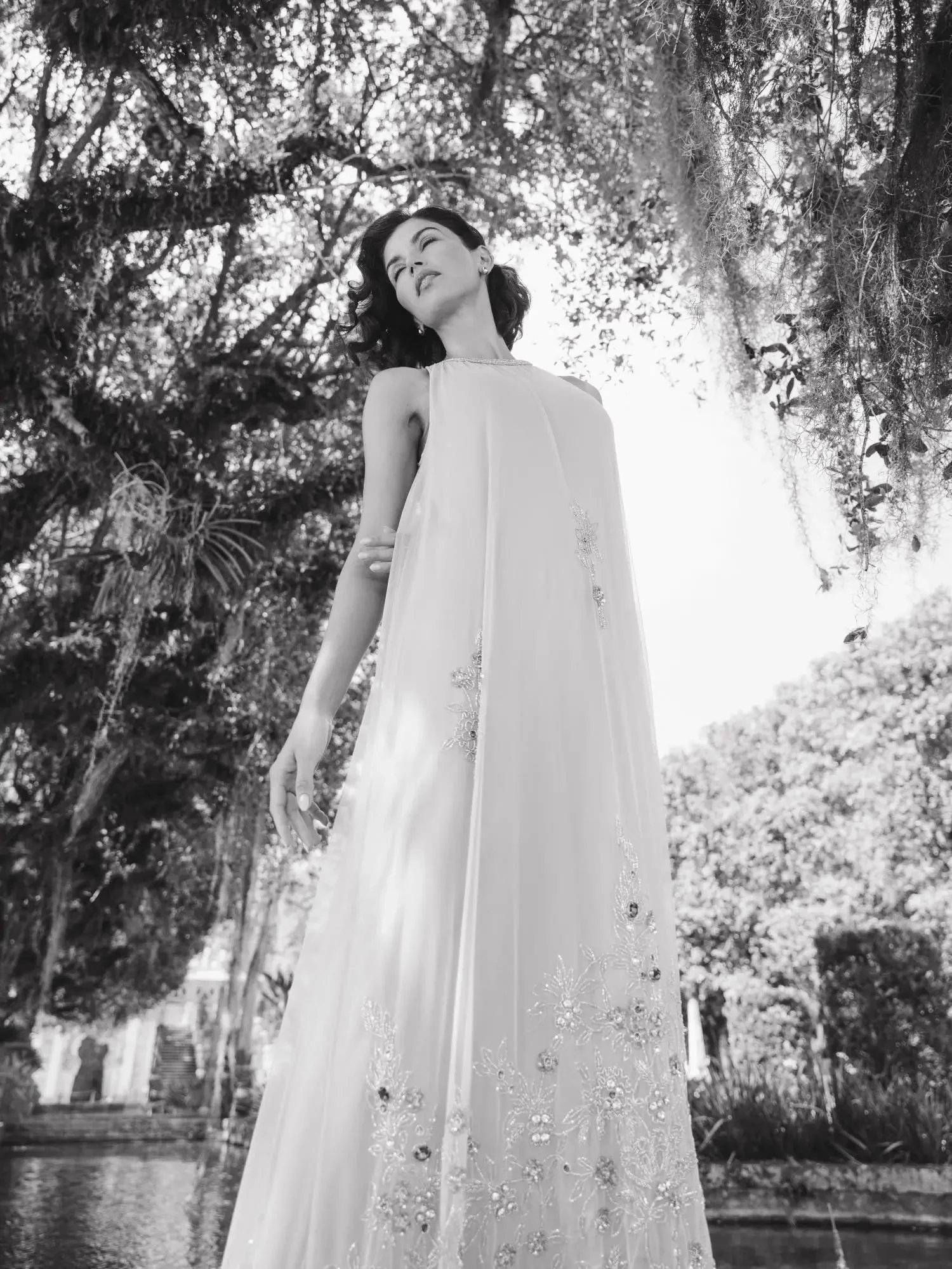 Beige High Neck Floral Embellished Trapeze Gown