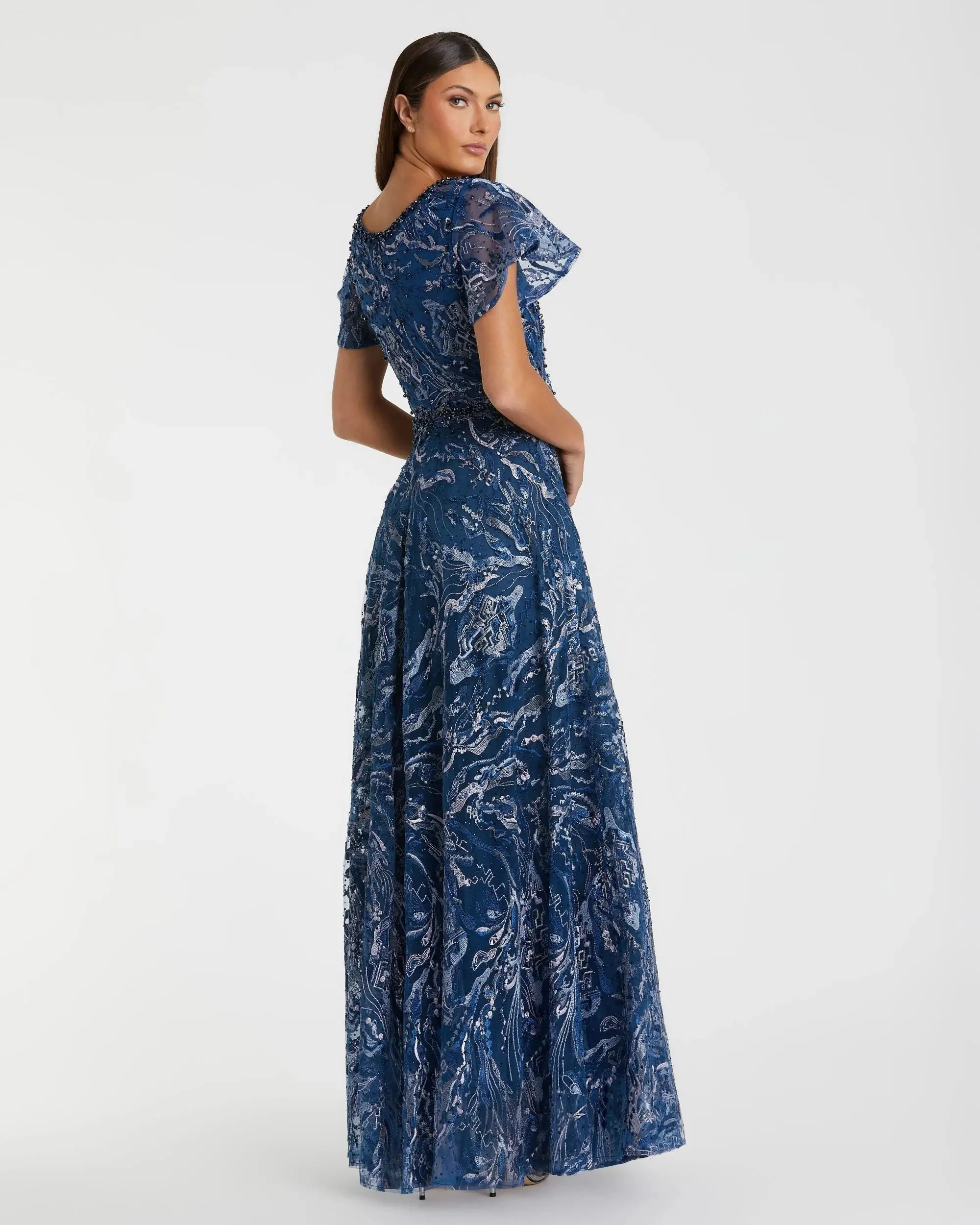 Navy Embellished Illusion Butterfly Sleeve A-Line Gown