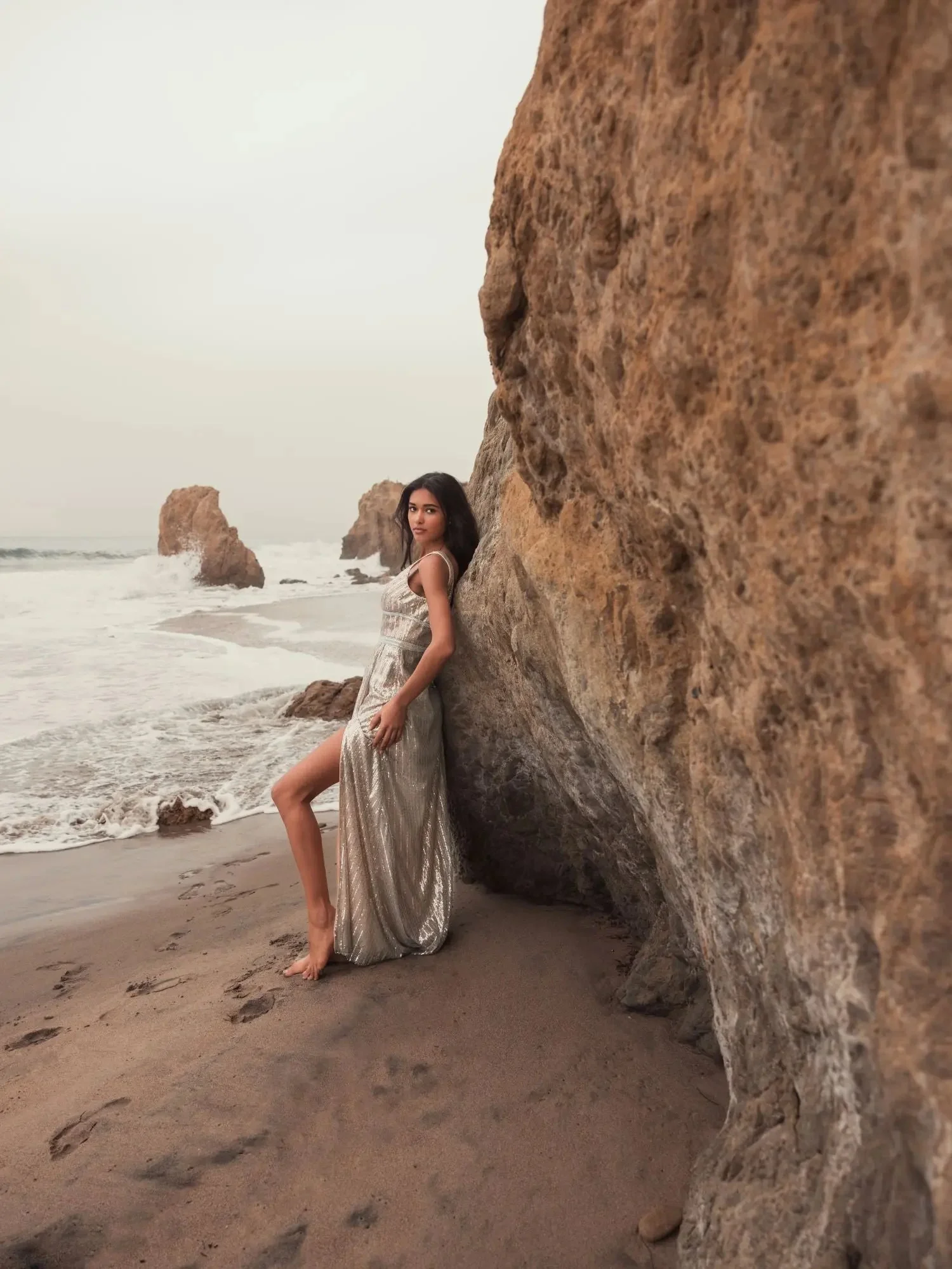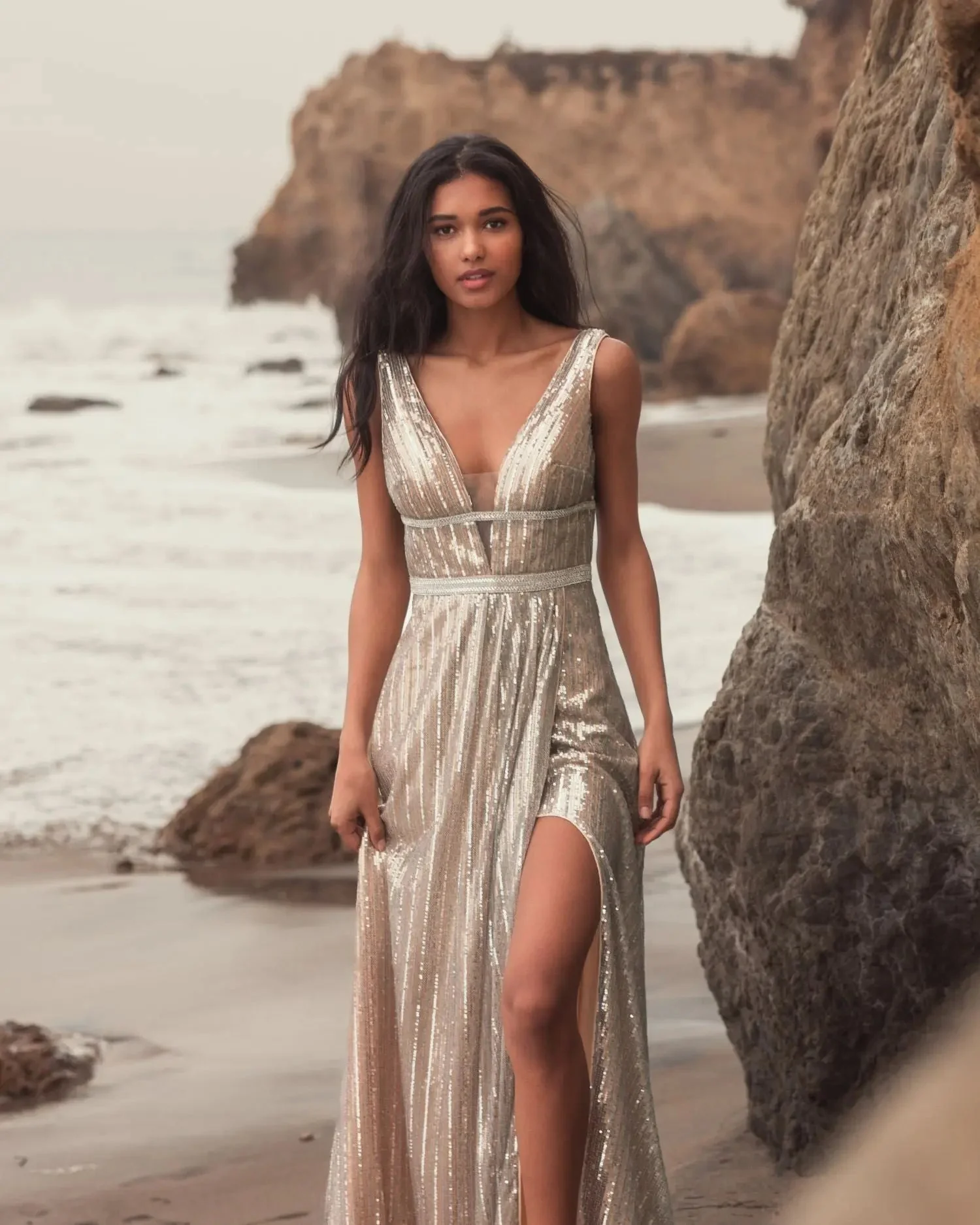 Silver Metallic Plunge Neck Sequined Gown