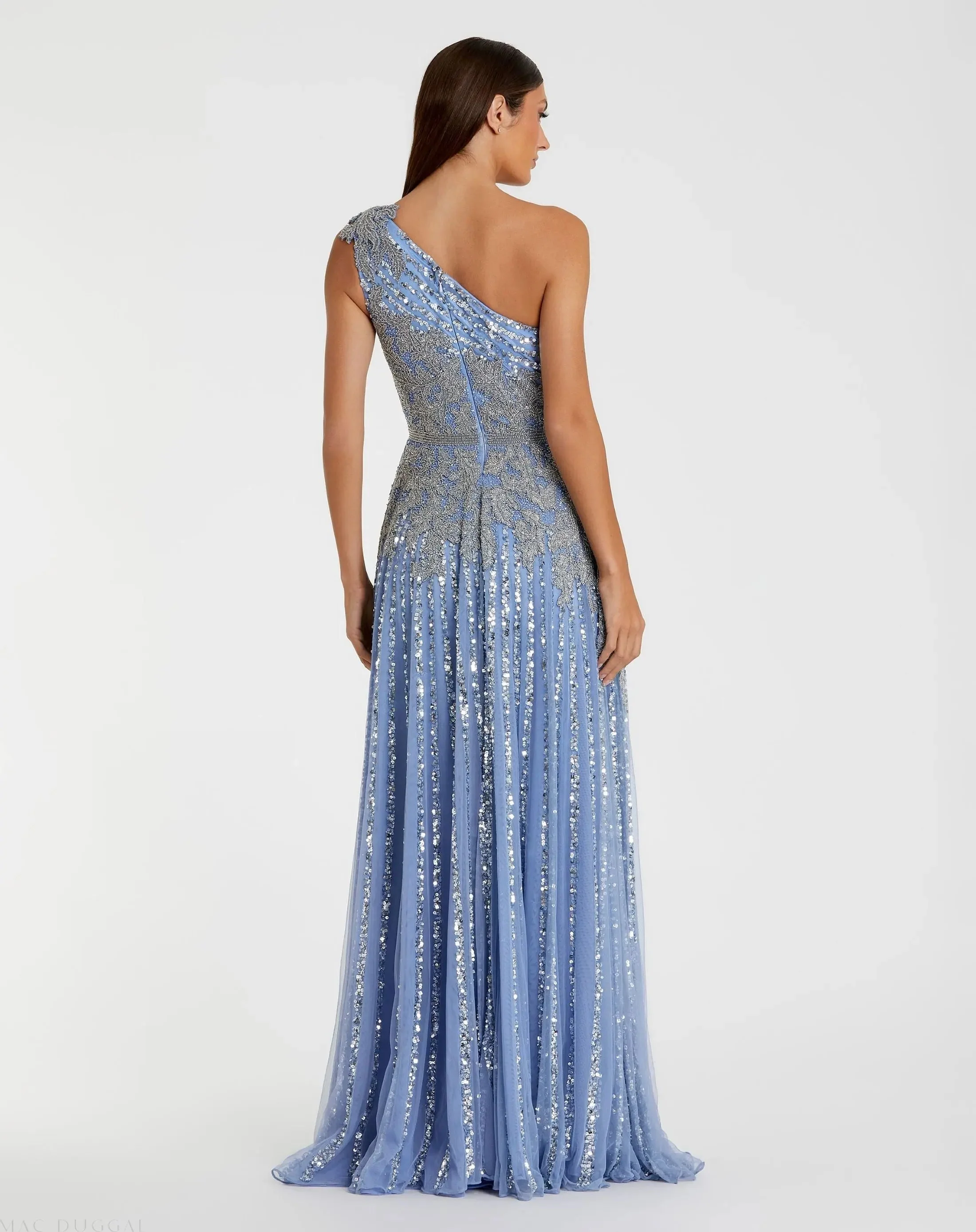 Blue Beaded Embellished One Shoulder A Line Gown