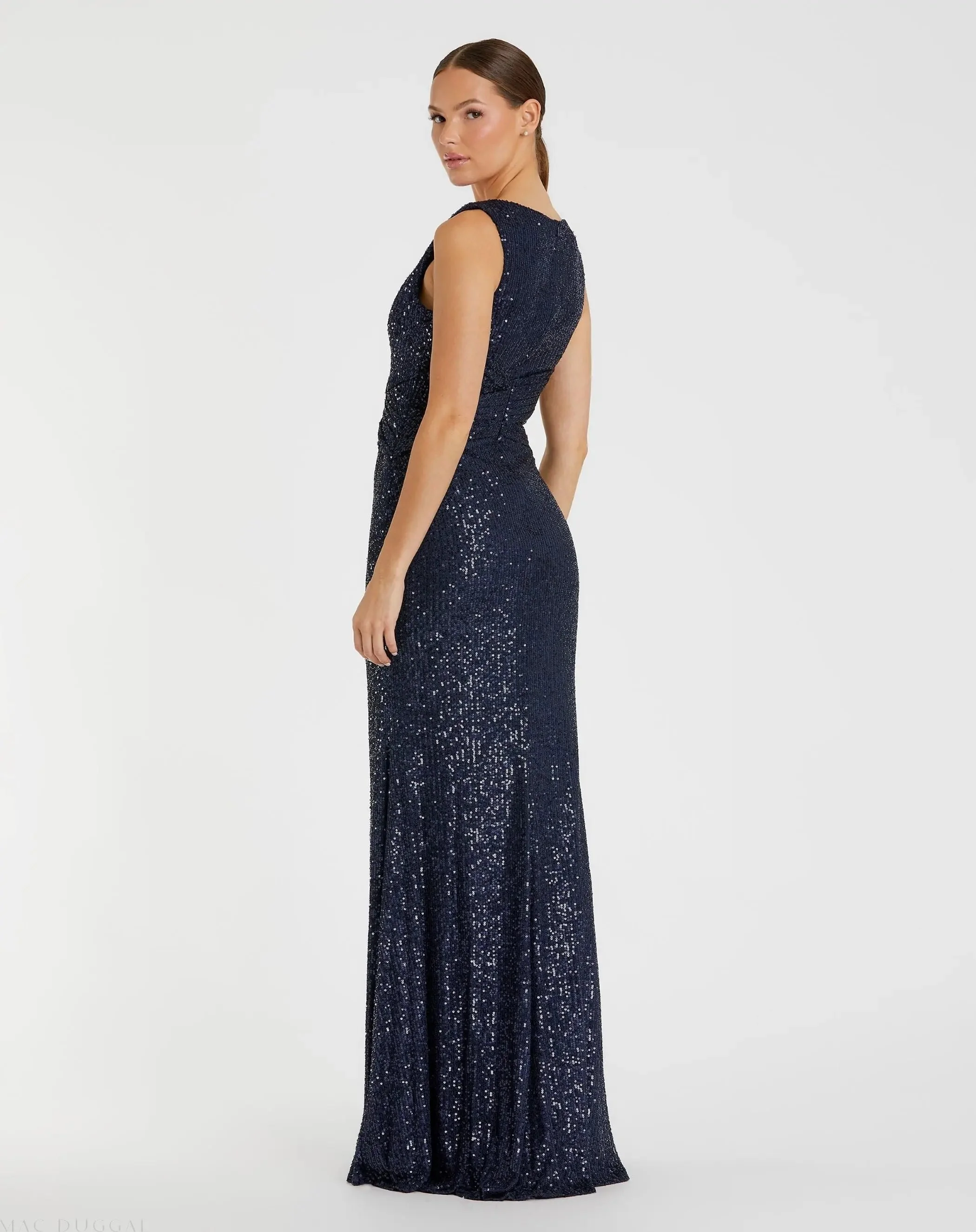 Navy V-Neck Sequin Wrap Waist Gown