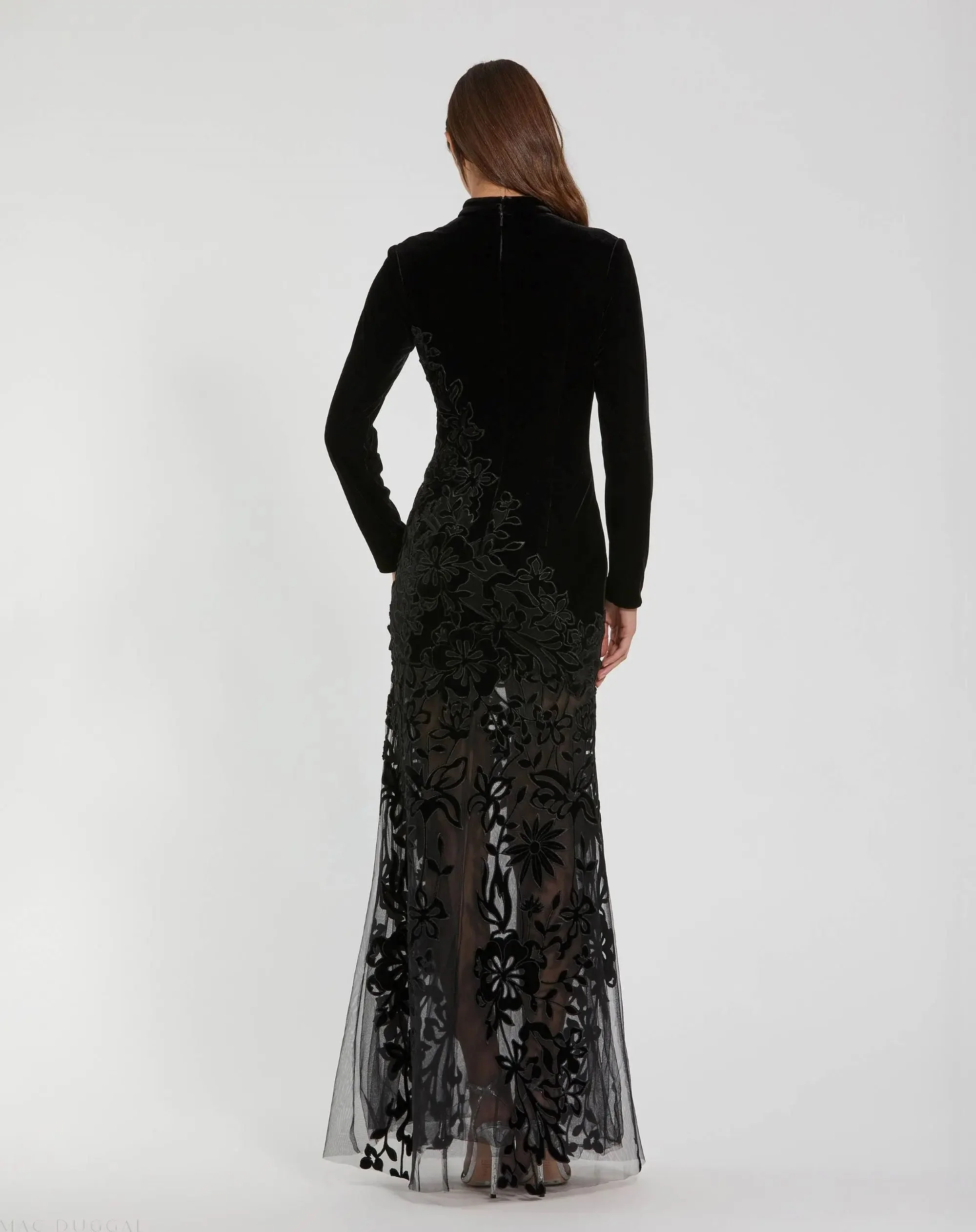 Black Long Sleeve Sheer Floral Embroidered Velvet Gown