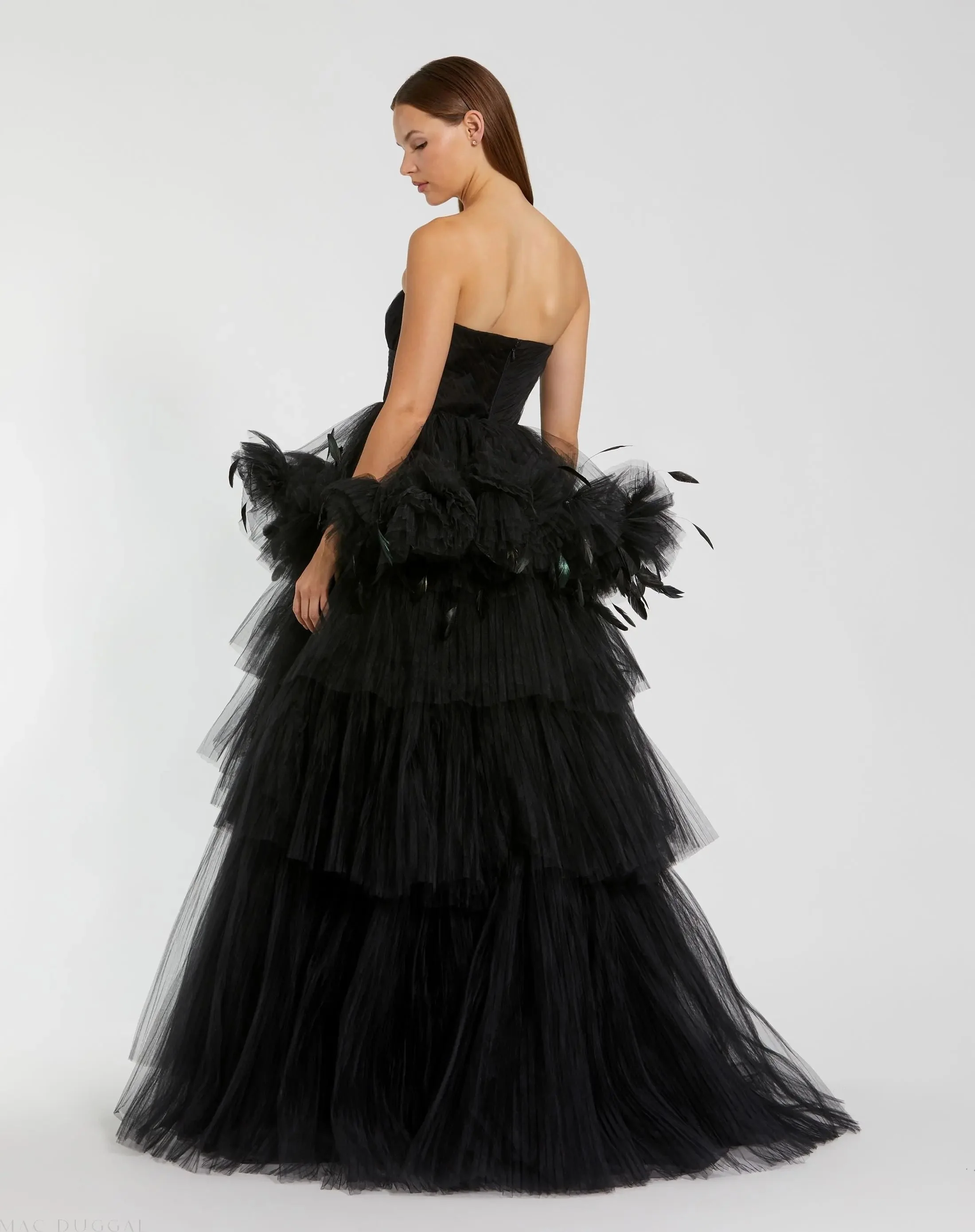 Black Strapless Tulle Gown with Feather Detail