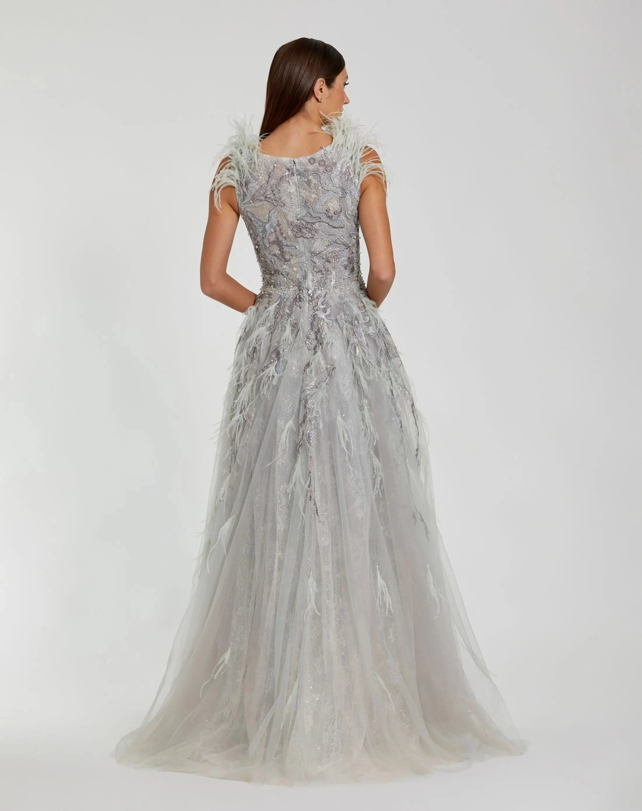 Green Embellished Feathered Sleeveless A Line Gown