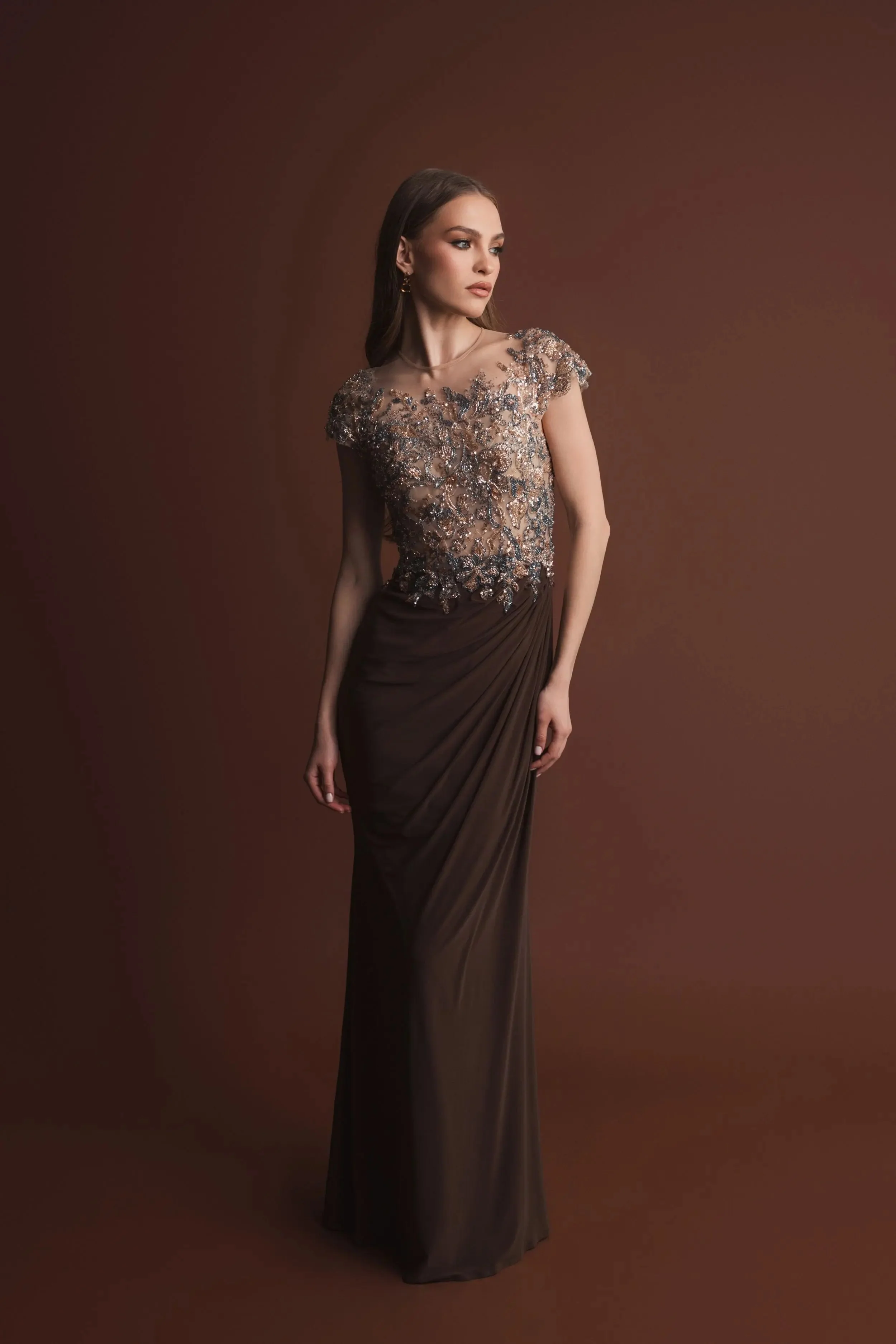 Purple Off The Shoulder Cap Sleeve Faux Wrap Gown