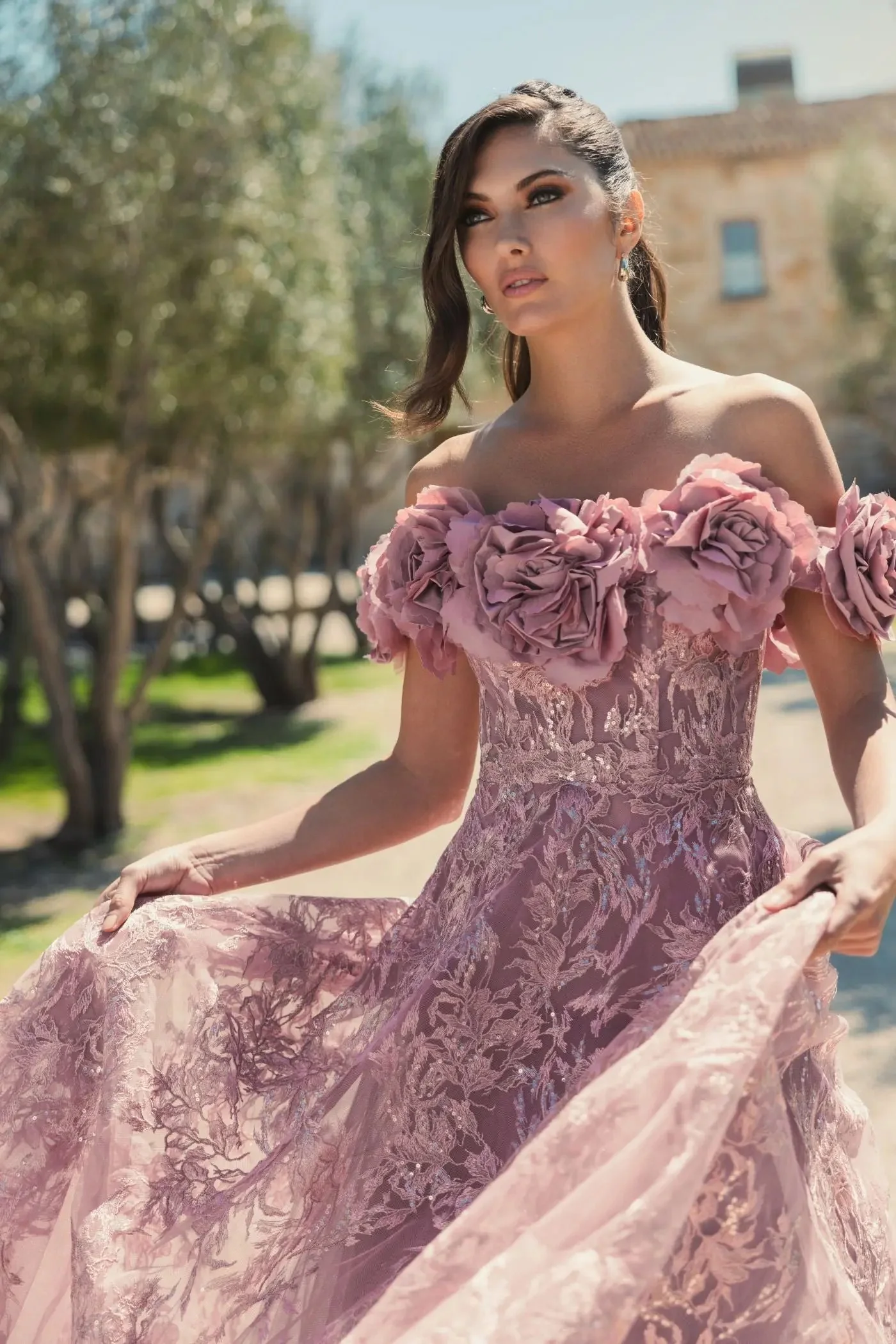 Purple Floral Embroidered Off The Shoulder A-line Gown