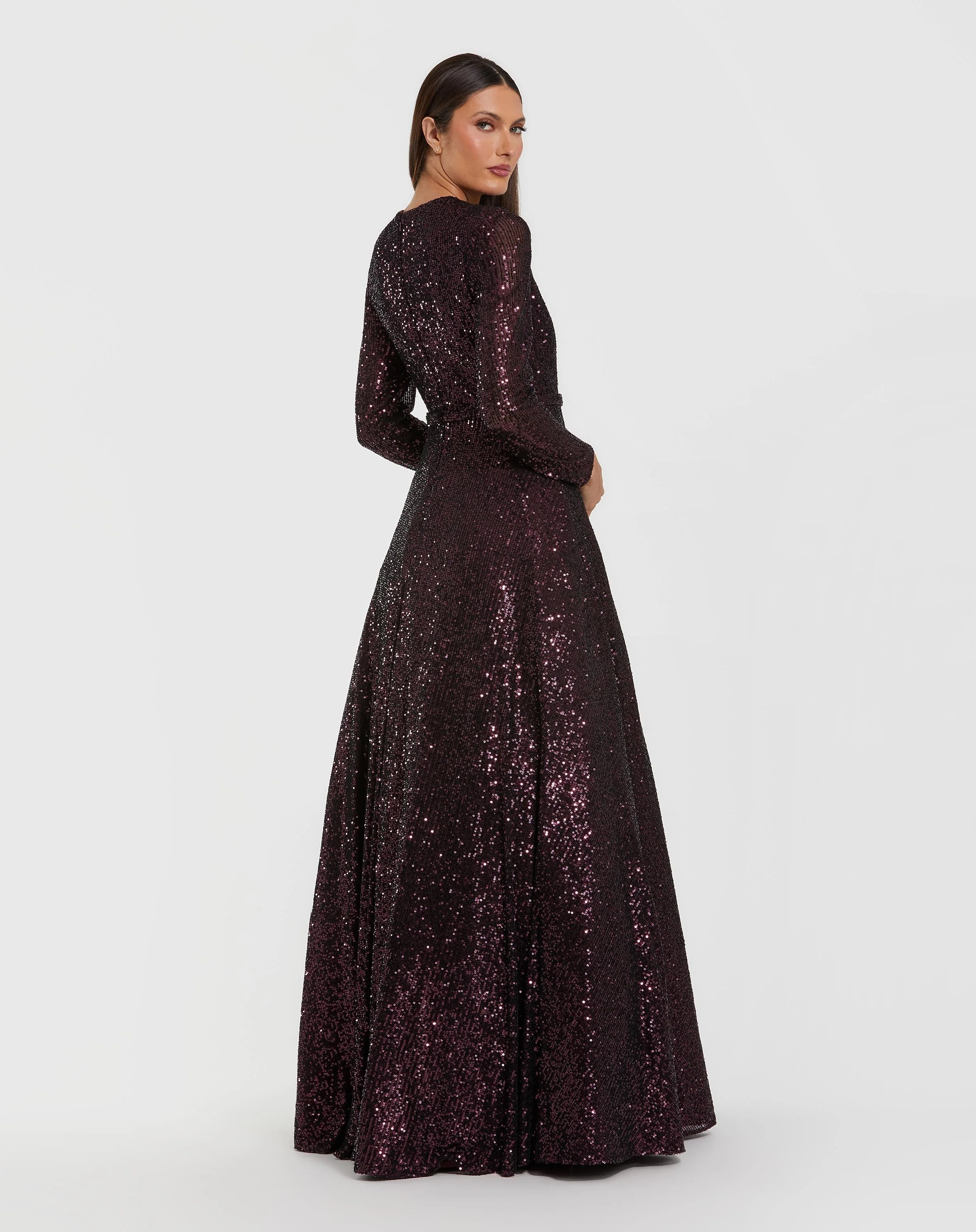 Dark Purple Long Sleeve Sequin Ball Gown With 3D Flower