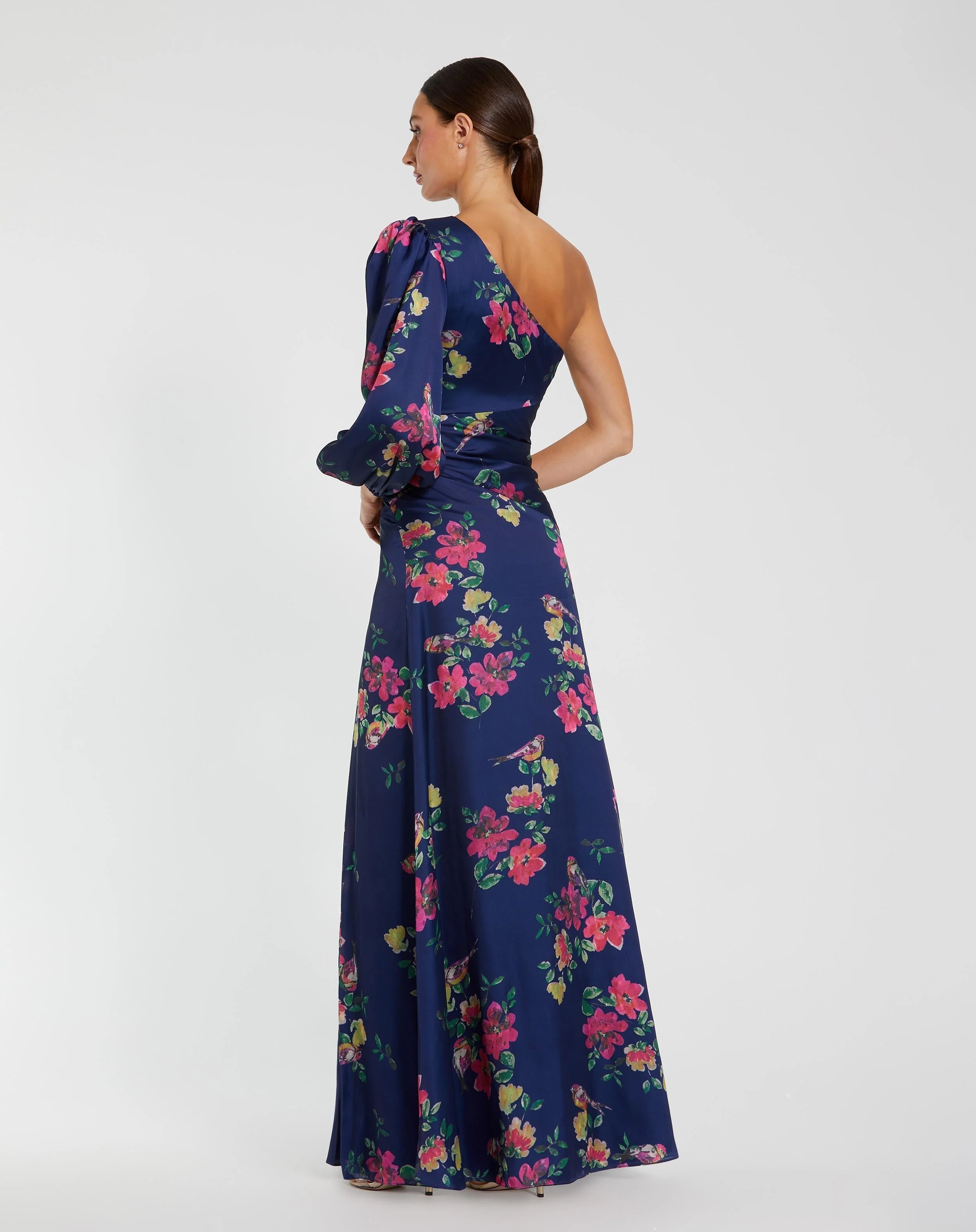 Navy One Sleeve Floral Print Charmeuse Gown With Slit