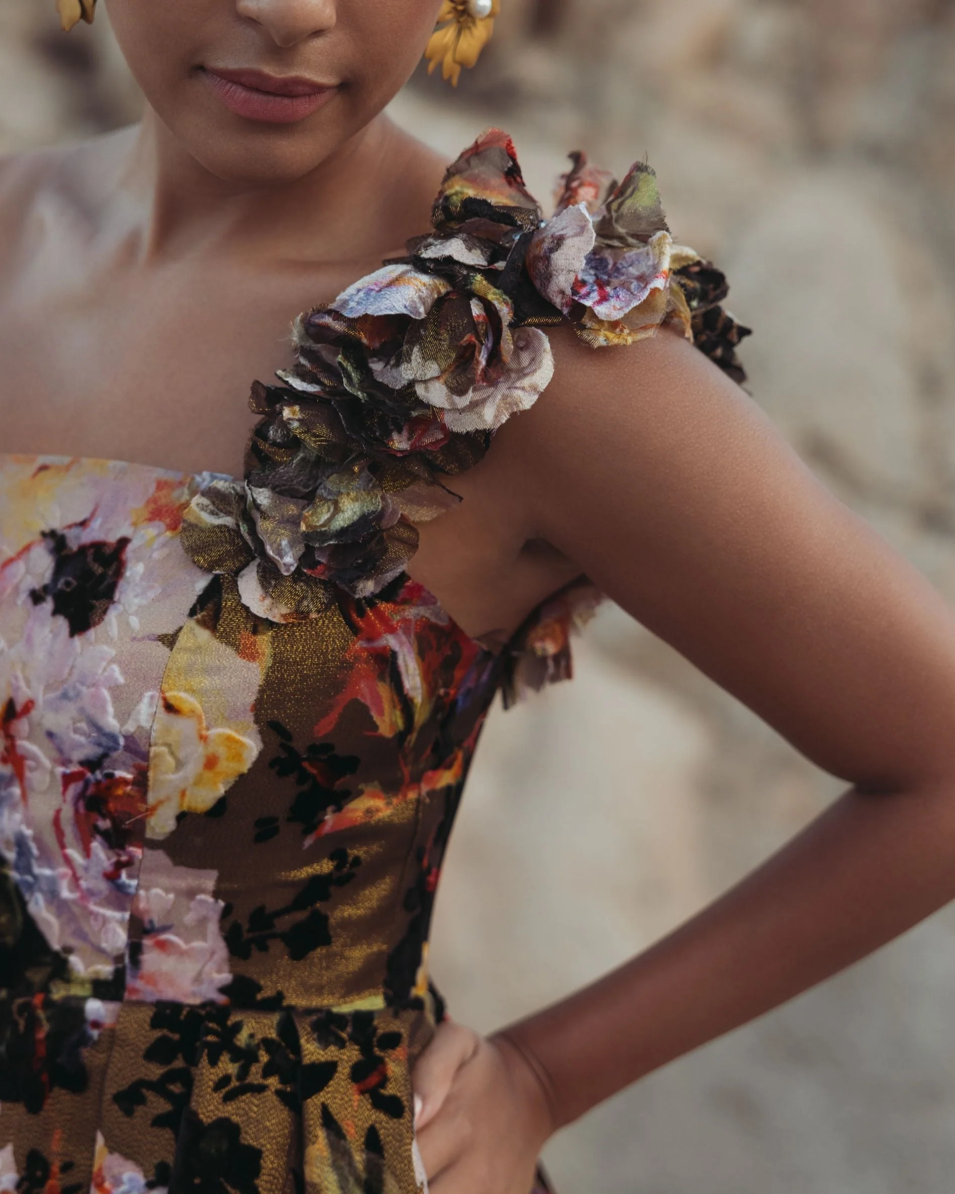 One Sleeve Floral Print Charmeuse Gown With Slit