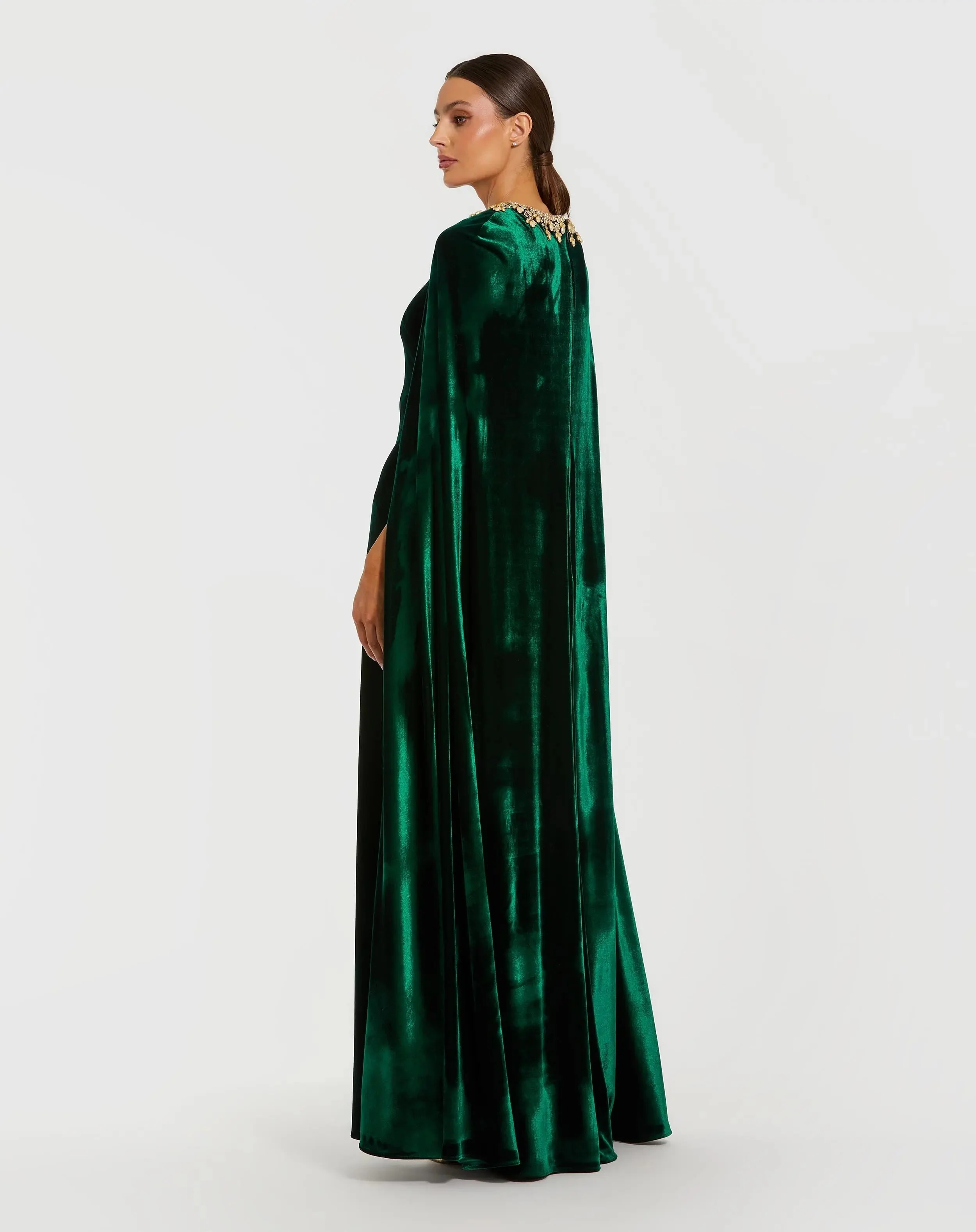 Dark Green Velvet Cape Gown With Embellished Neckline