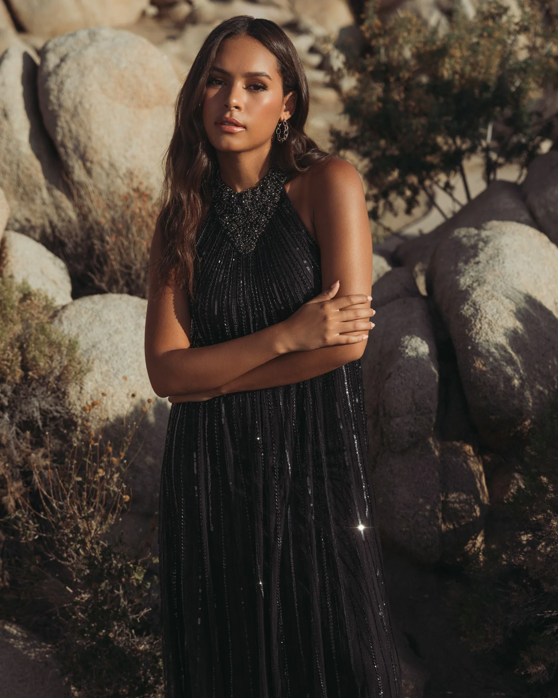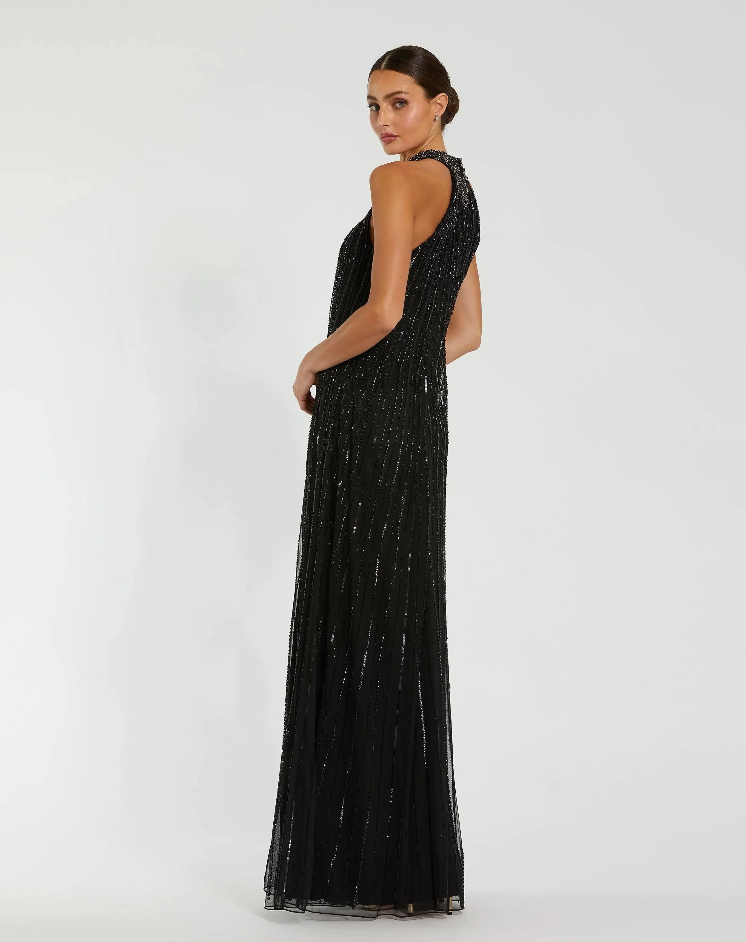 Black Sleeveless Halter Neck Embellished Trapeze Gown