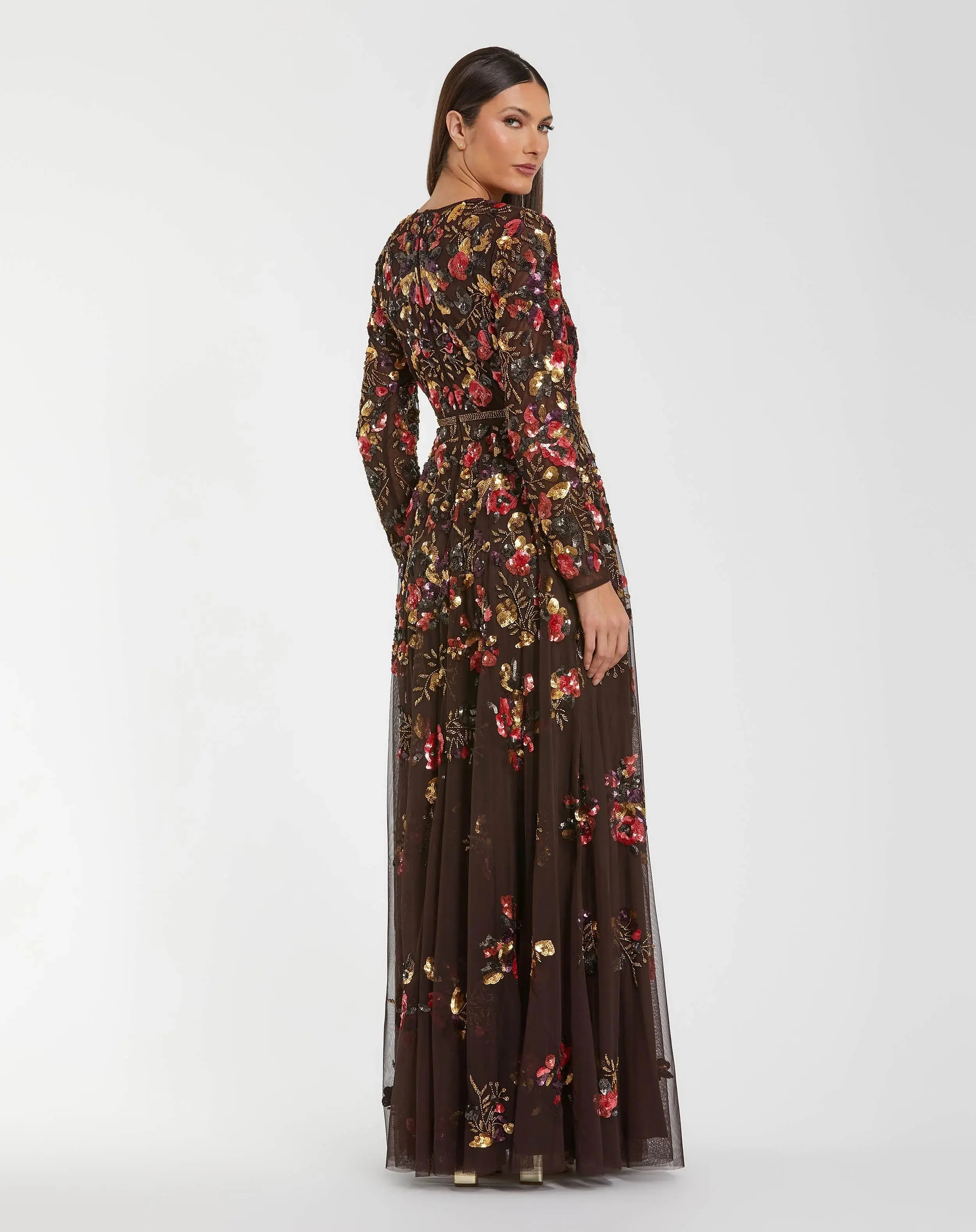 Brown Long Sleeve Floral Embellished Evening Gown