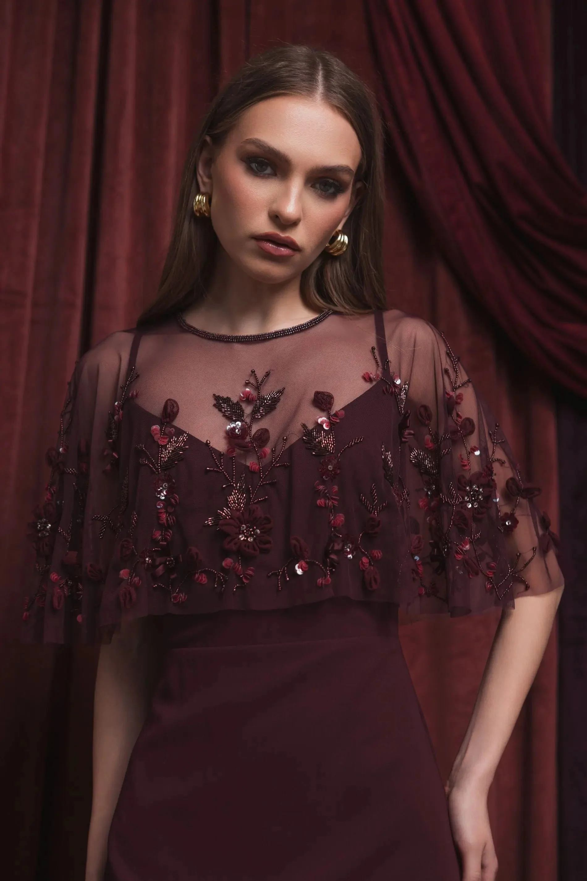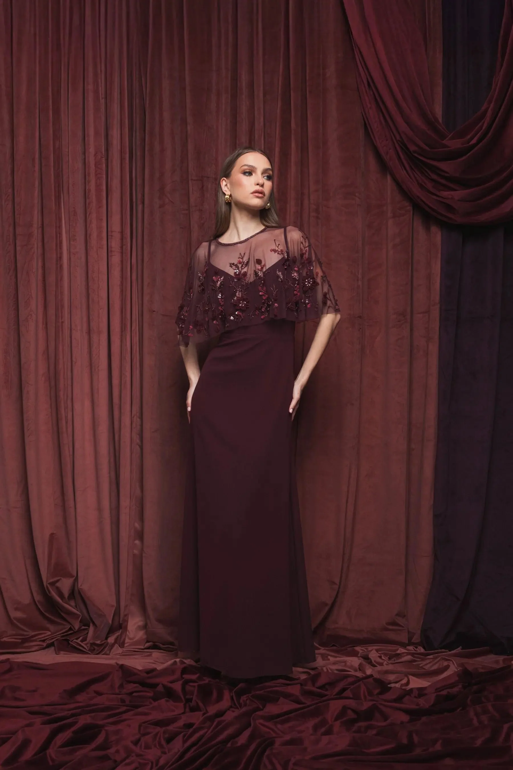 Burgundy Sleeveless Gown With Embellished Cape