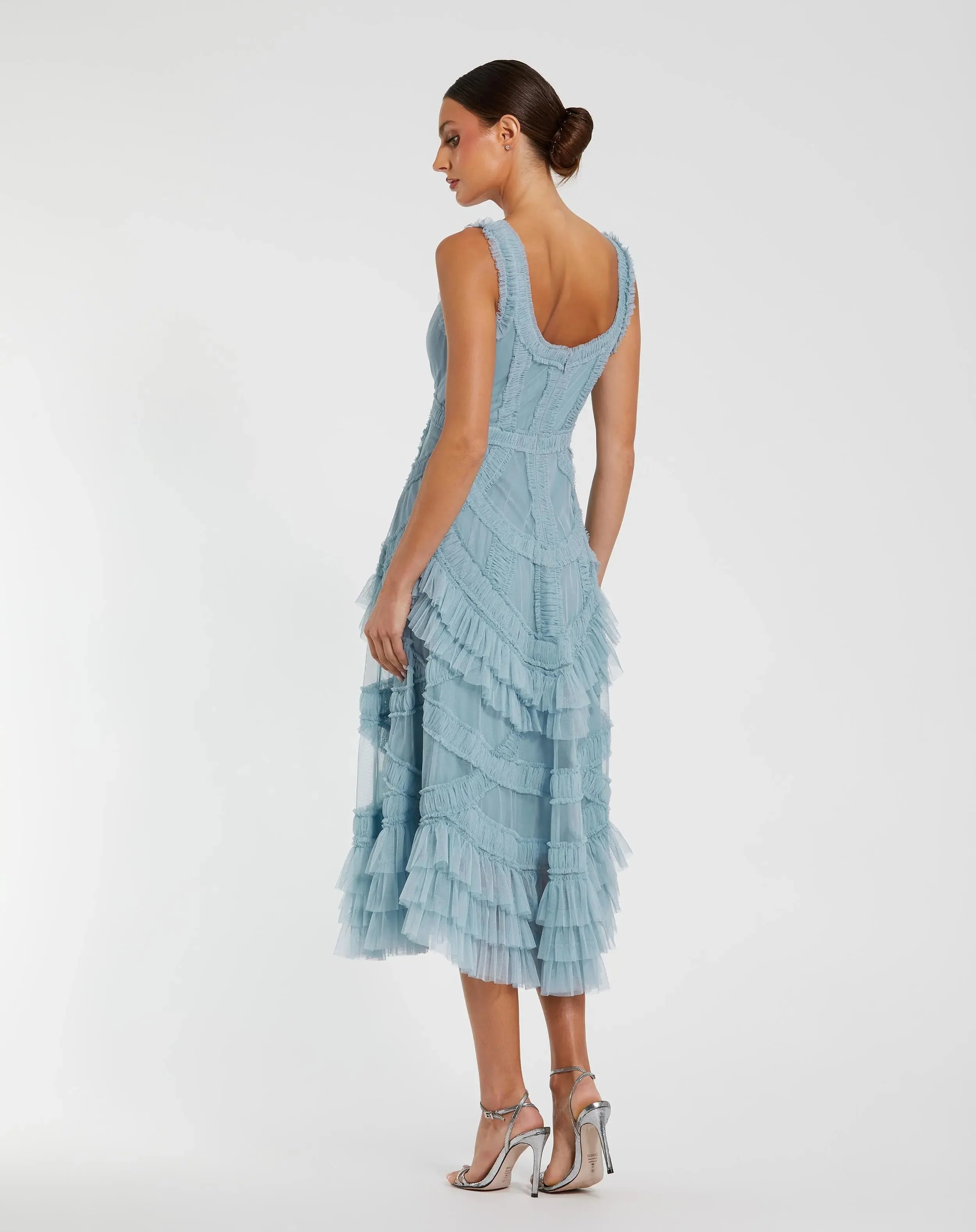 Blue Scoop Neck Sleeveless A-Line Ruffle Midi Dress