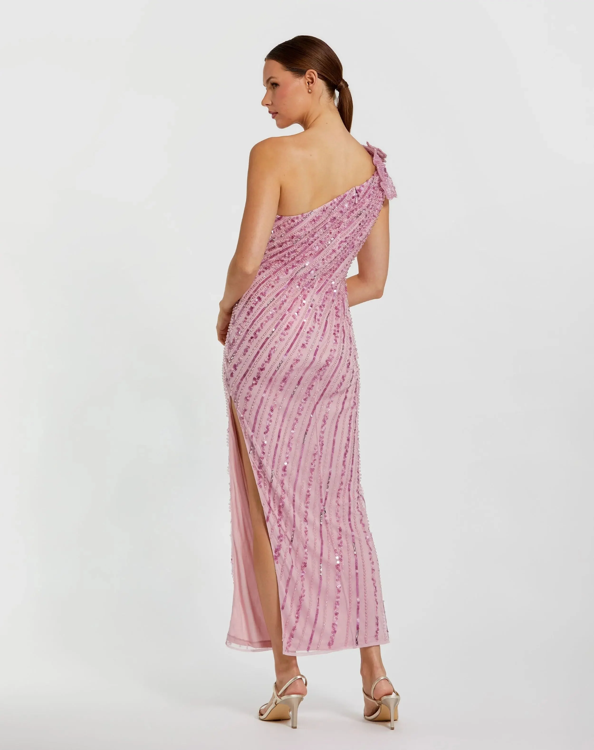 Pink One Shoulder Beaded Mesh Dress With Flower