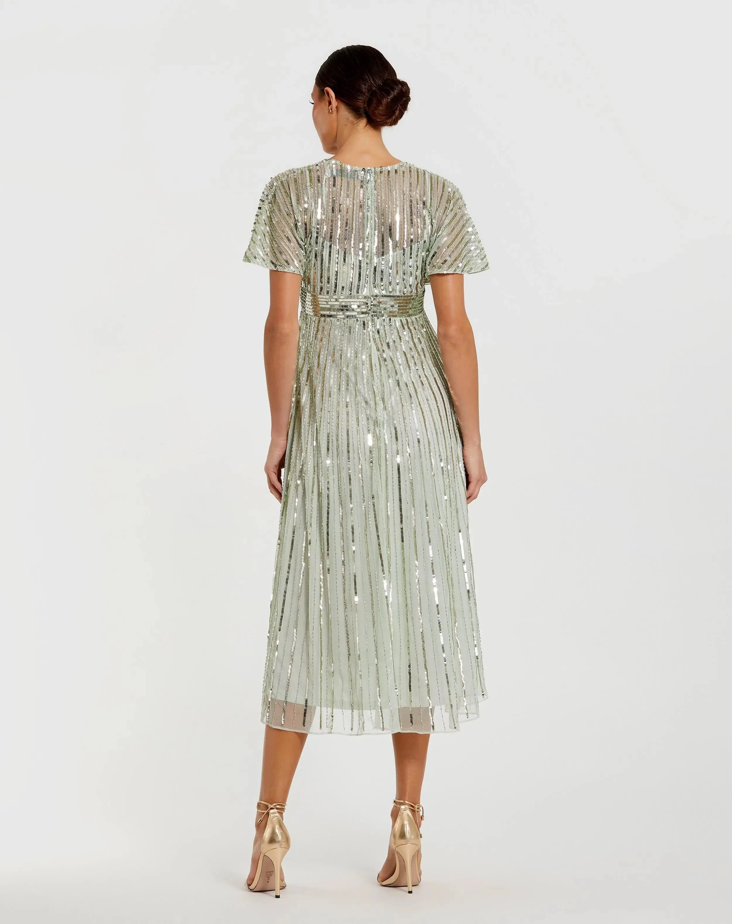 Sequined V Neck Flutter Cap Sleeve Trumpet Dress
