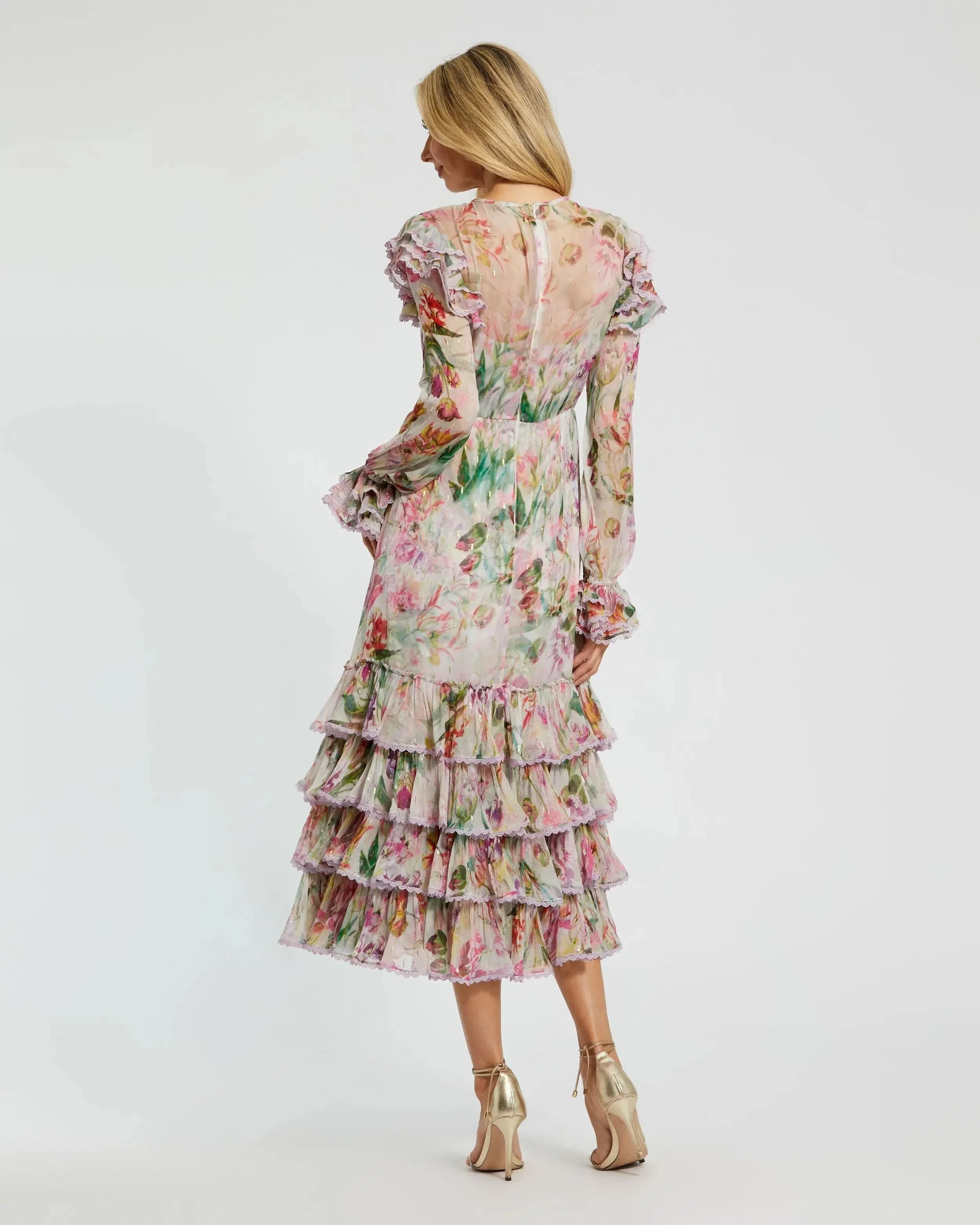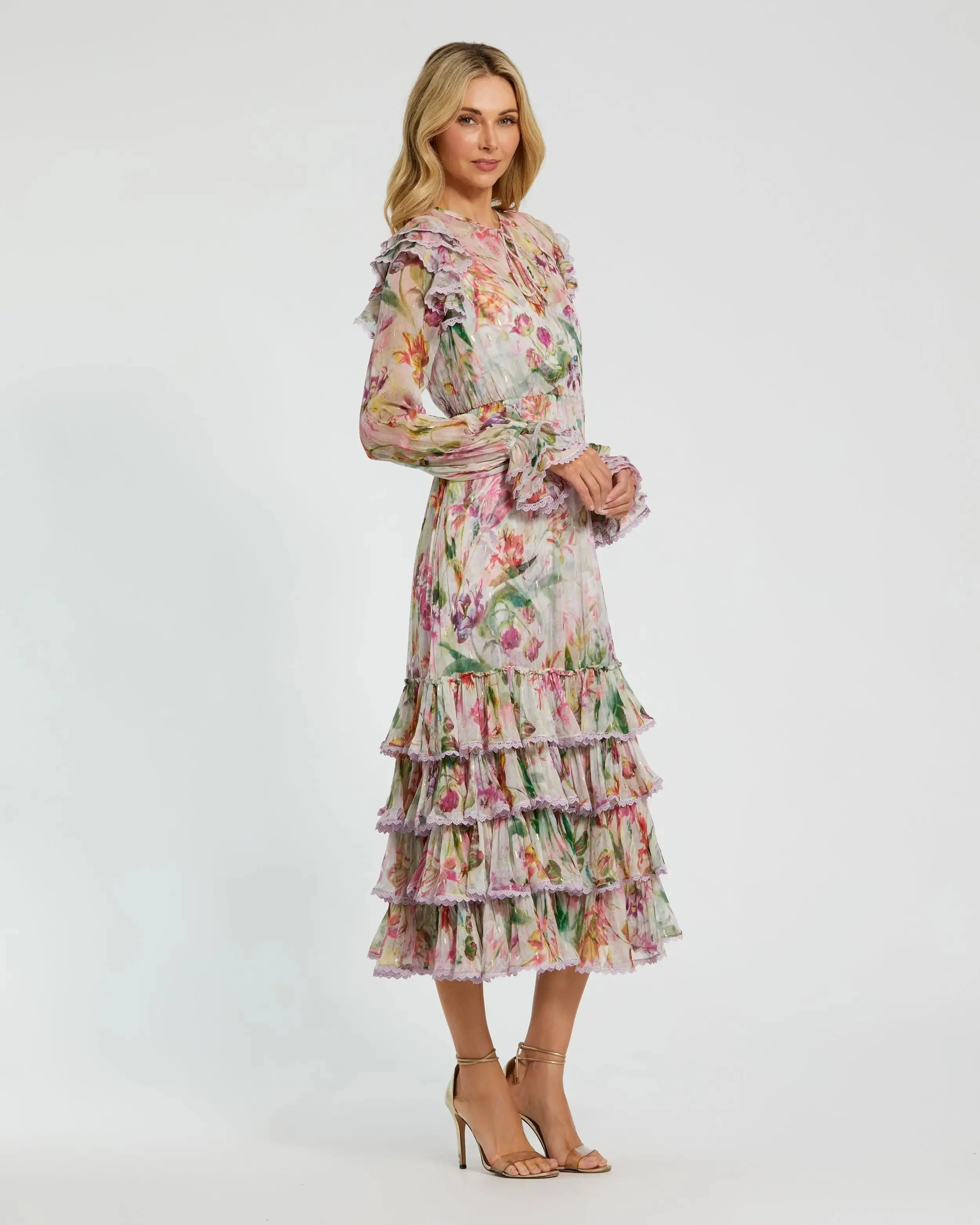Multicolor Long Sleeve Ruffle Detail Floral Shift Dress