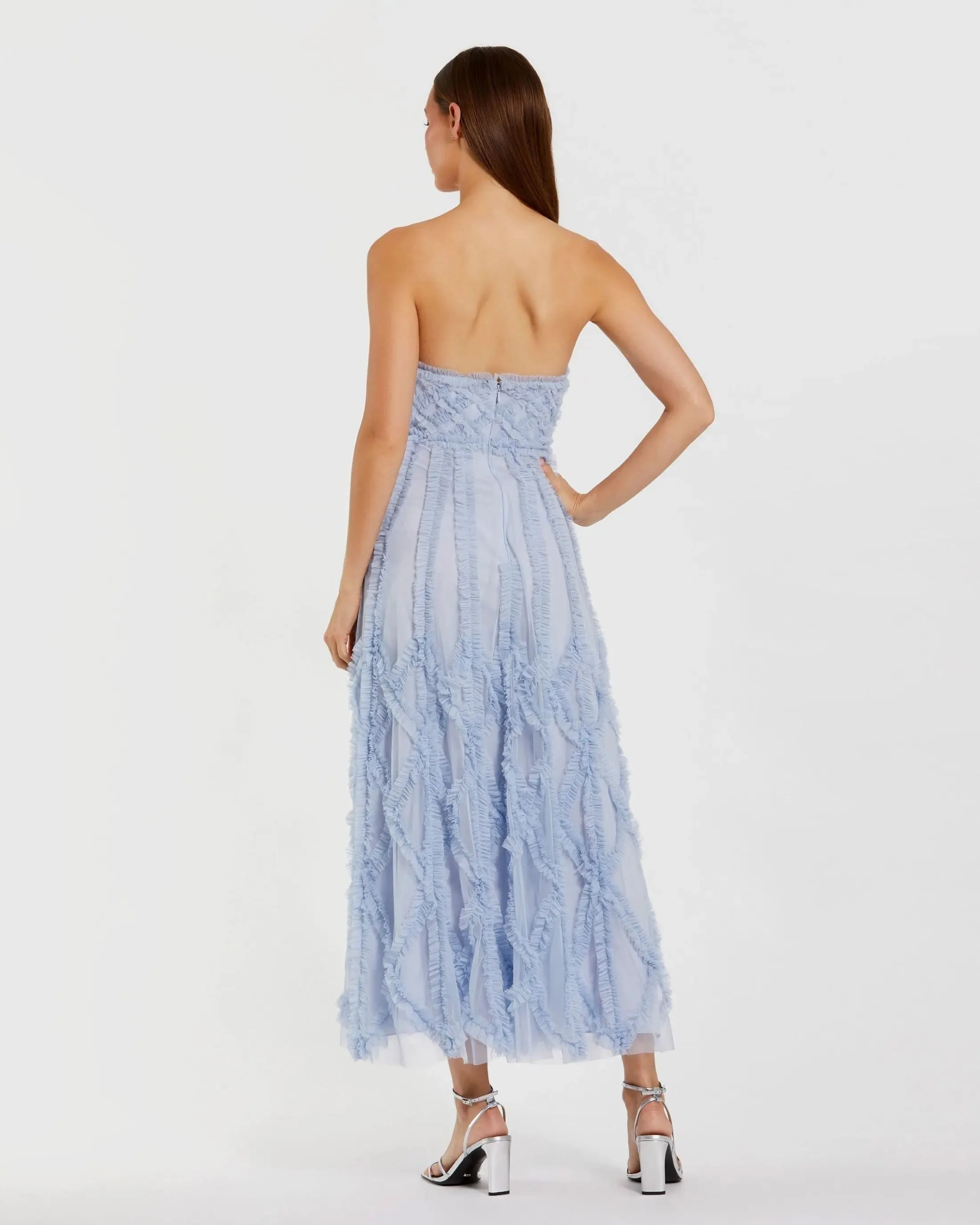 Blue Mesh Ruffle Strapless A-Line Midi Dress