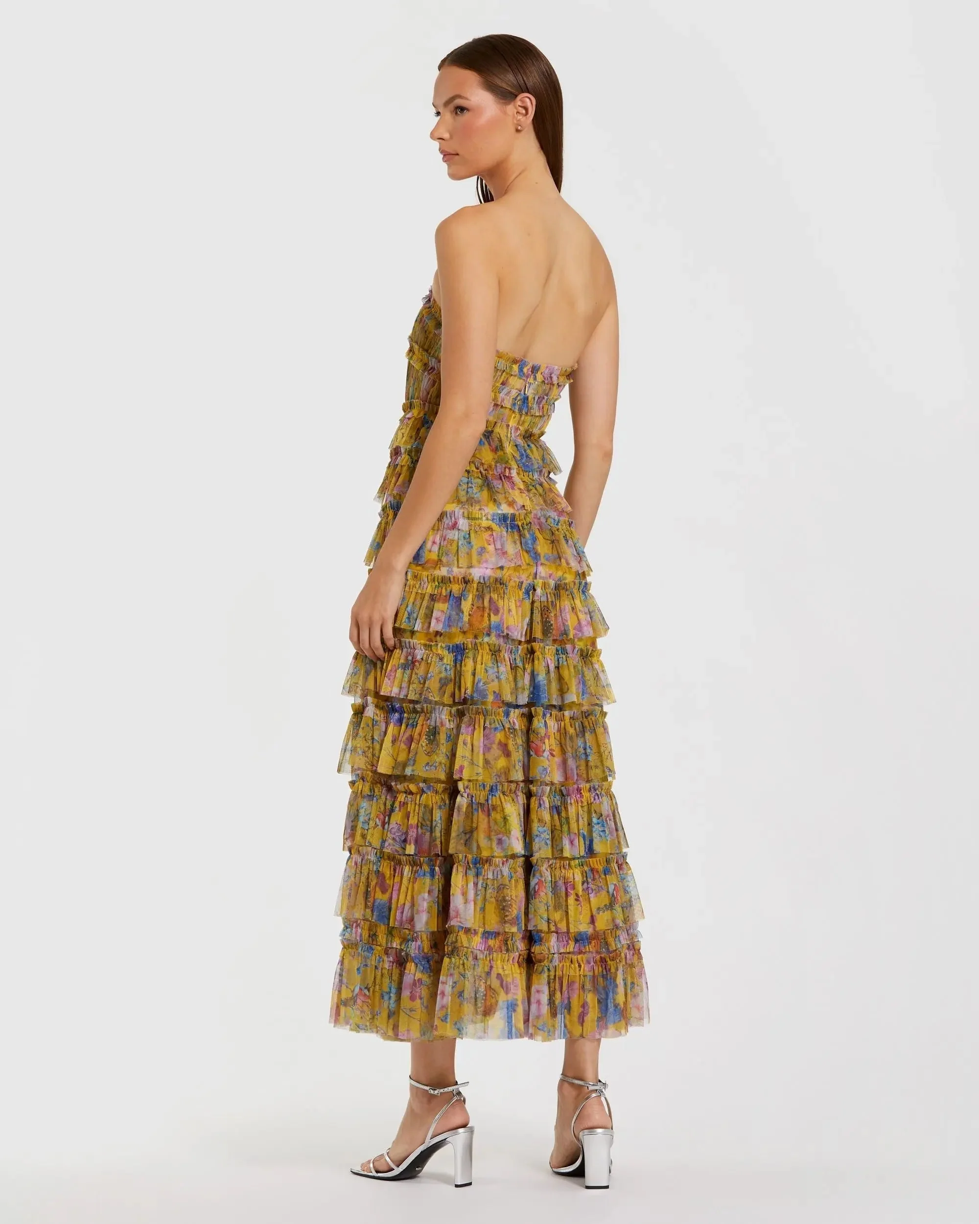 Yellow Floral Strapless Ruffle Maxi Dress