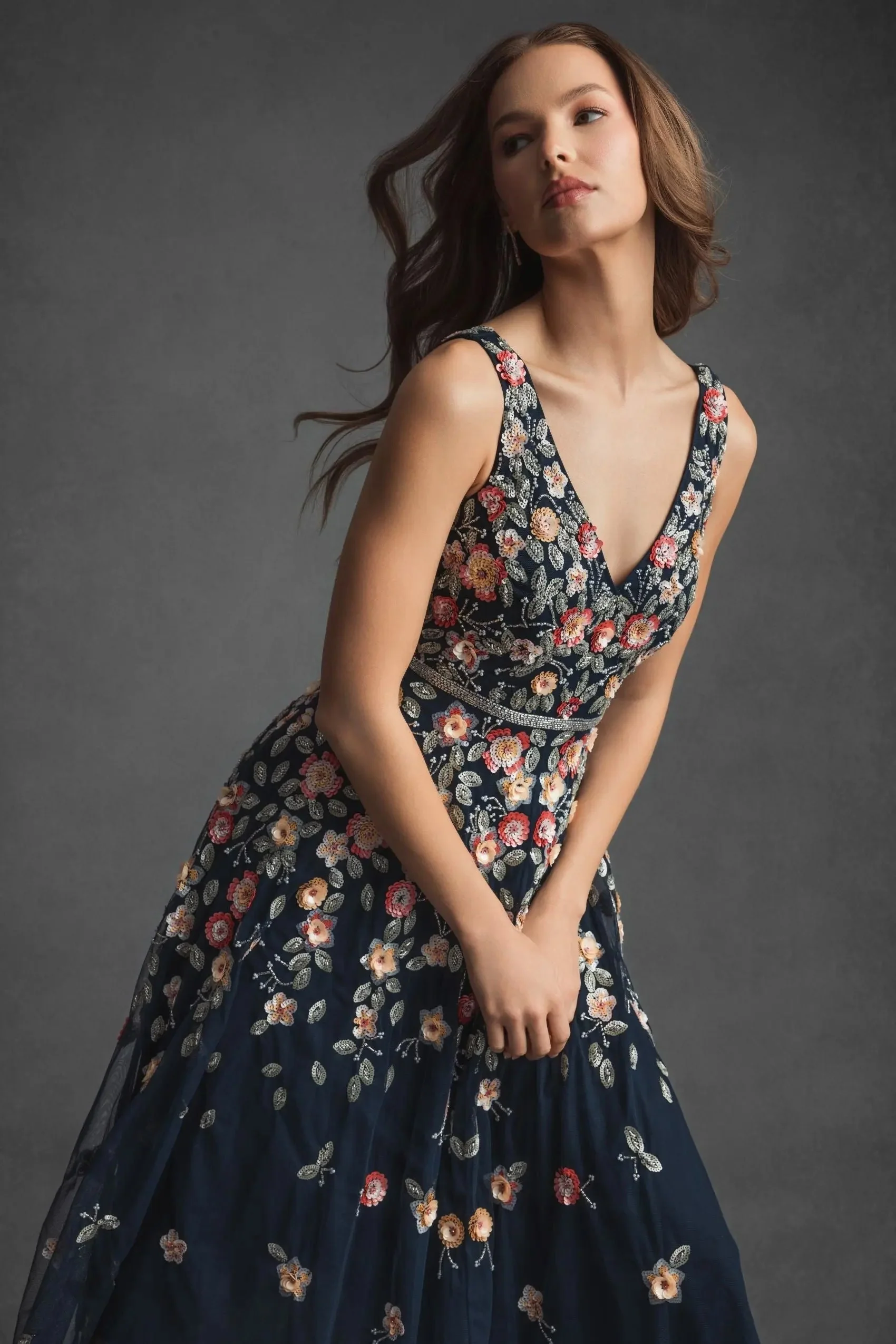 Navy V-Neck Sleeveless Midi Floral Beaded A-line Dress