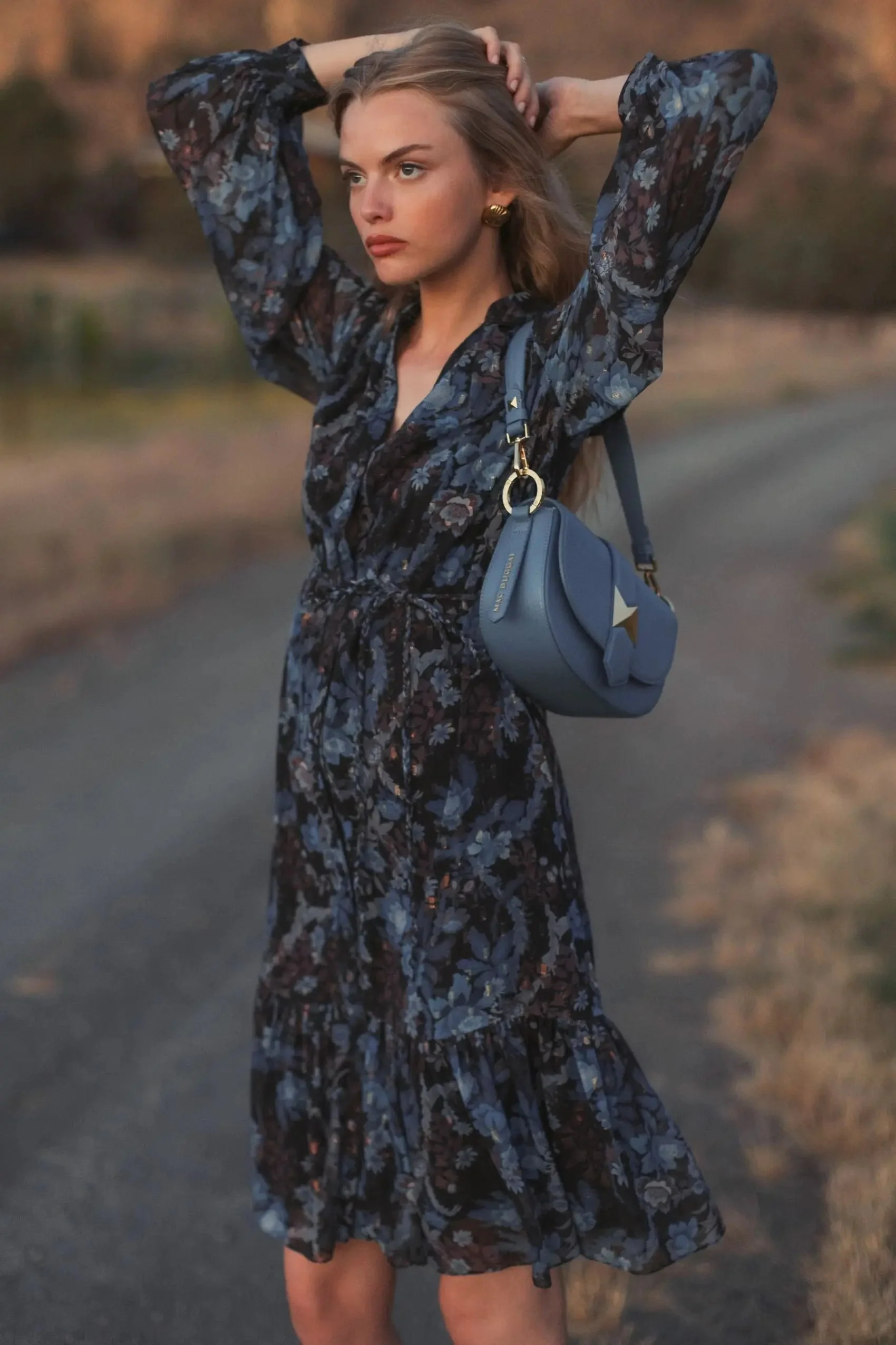 Blue Lurex Chiffon Bishop Sleeve Button Up Midi Dress